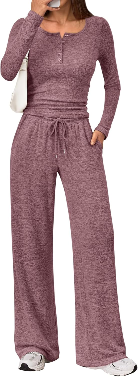 Trendy Queen Women's 2 Piece Matching Lounge Sets Fall Fashion Outfits Henley Neck Sweater Top Wide Leg Pants Sweat Suits