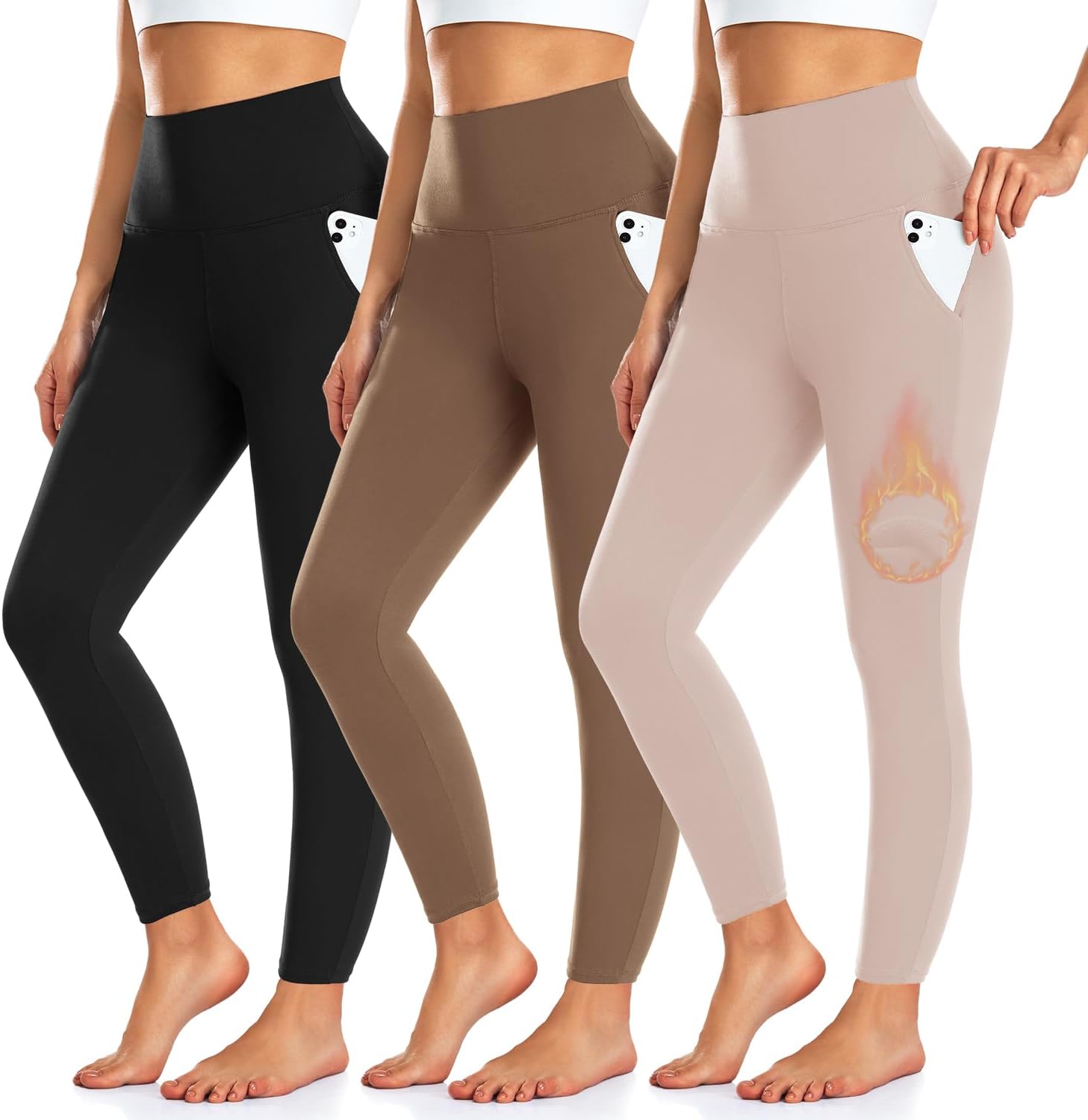 3 Pack Fleece Lined Leggings Women with Pockets -Warm Winter Yoga Pants for Women Thermal Running Workout Leggings