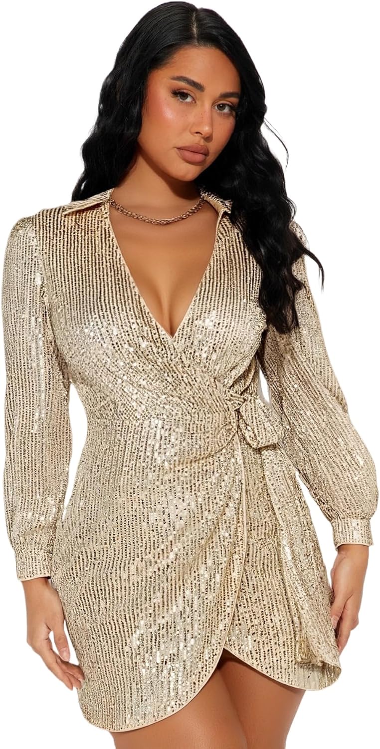 Sequin Saprkly Mini Dress Long Sleeve Homecoming V Neck Bodycon Dress Party Prom Cocktail Glitter Dress