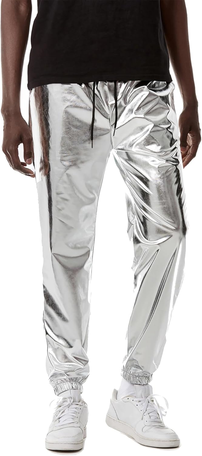 ZEROYAA Mens Metallic Shiny Sweatpants Disco Party Elastic Trousers