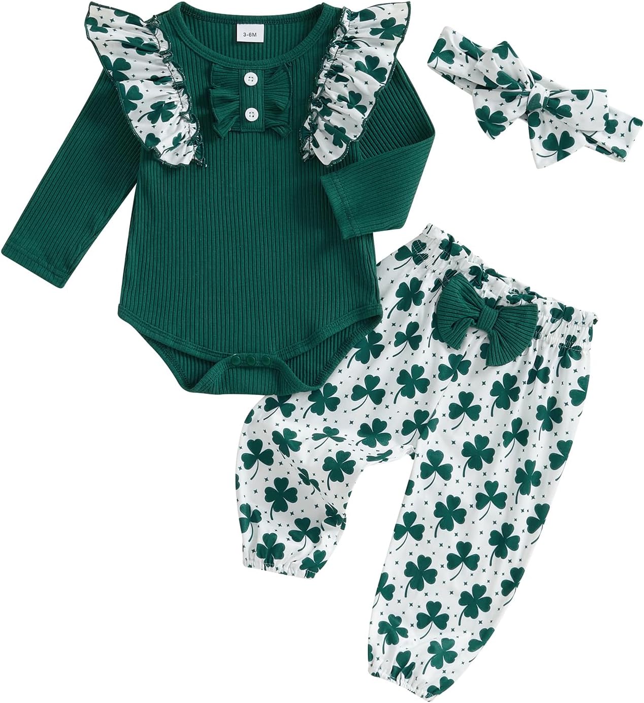 Rtnnsbbfcm Newborn Baby Girl Valentine's Day Outfit Long Sleeve Ribbed Romper Heart Print Pants Headband 3Pcs Set