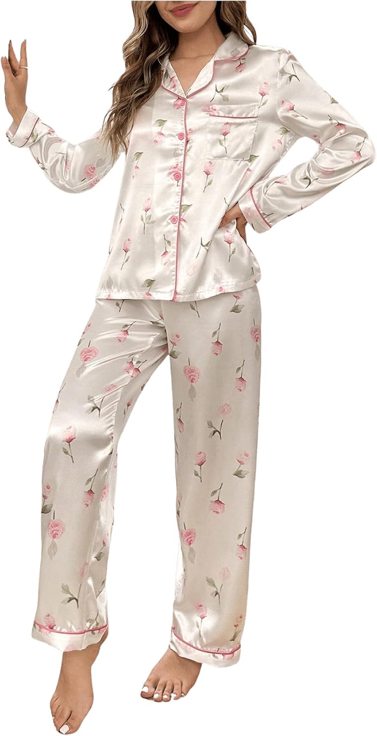 SweatyRocks Women's 2 Piece Satin Pajama Set Floral Print Button Down Long Sleeve Top and Pants Sleepwear