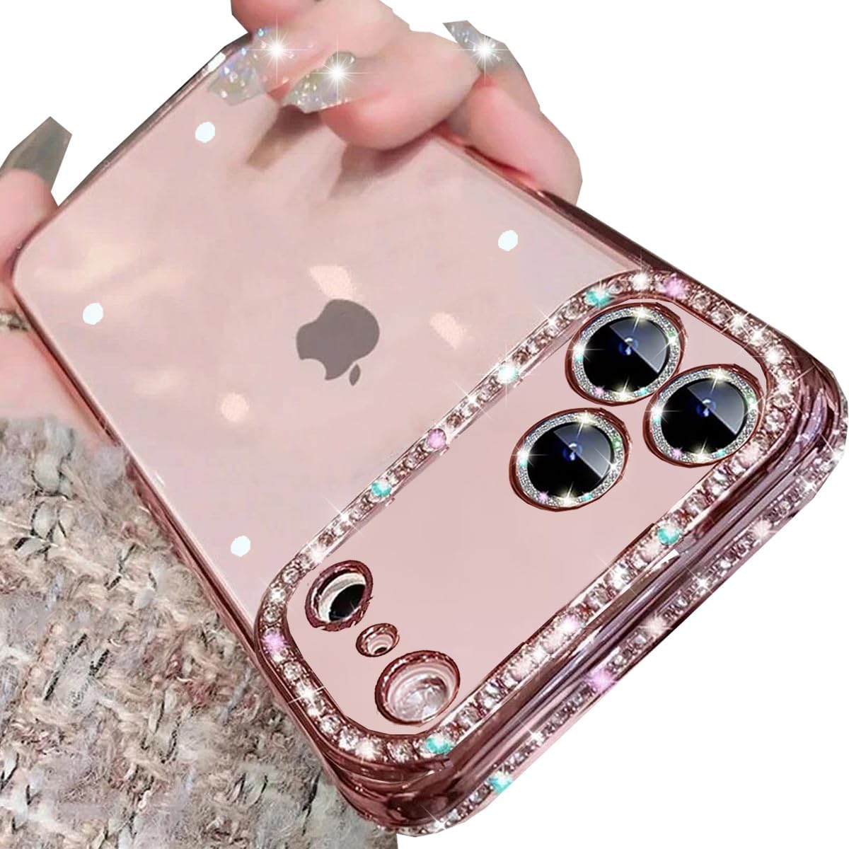 Clear Glitter Case for iPhone 17 Pro, Cute Luxury Bling Sparkly Diamond Rhinestone with Camera Lens Protector TPU Plating Bumper Slim Transparent Women Girls Case for iPhone 17 Pro 6.3",Pink
