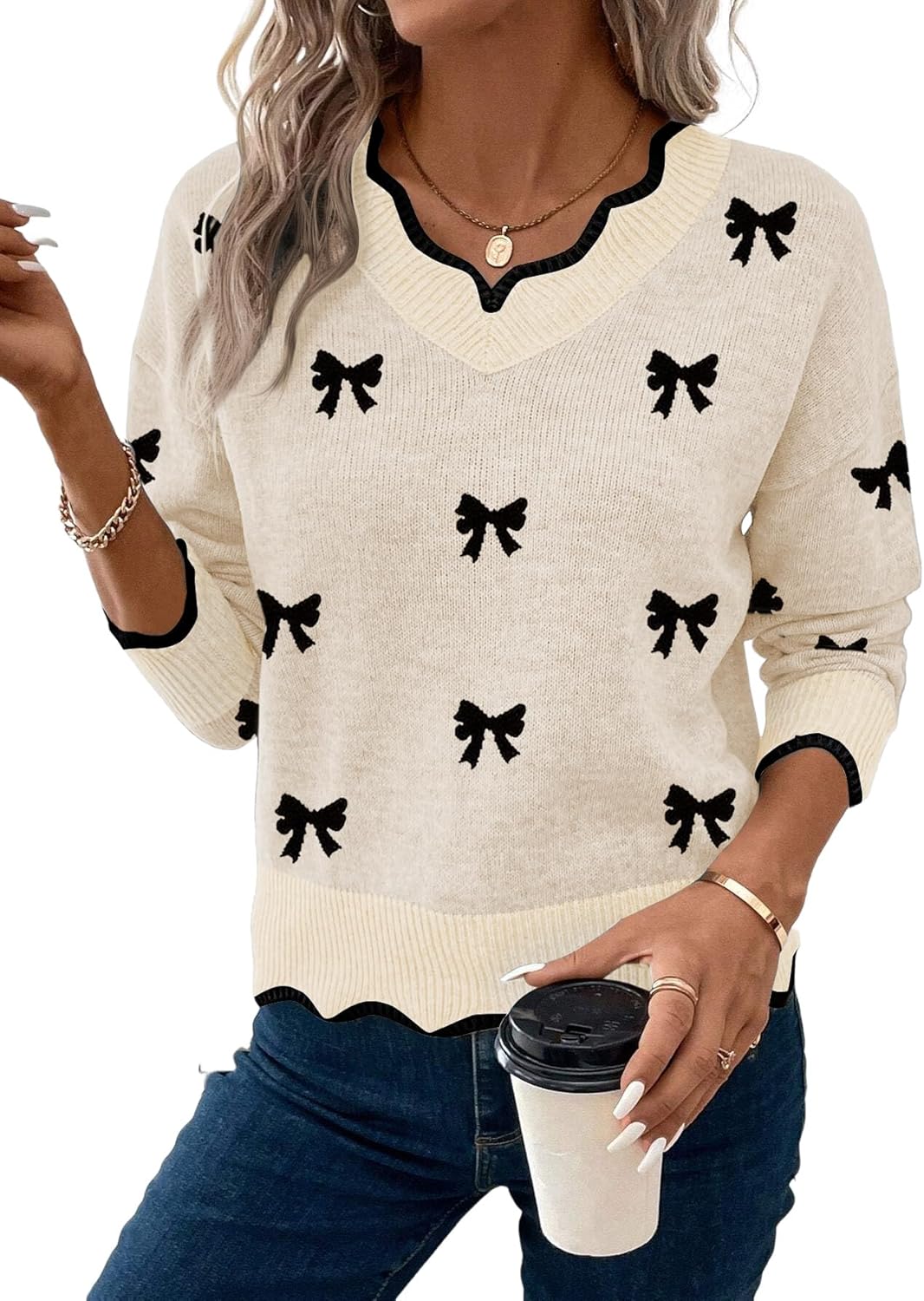 Womens V Neck Pullover Sweaters Long Sleeve Scallop Trim Knit Tops Loosed Fit 2025 Fall Outfits