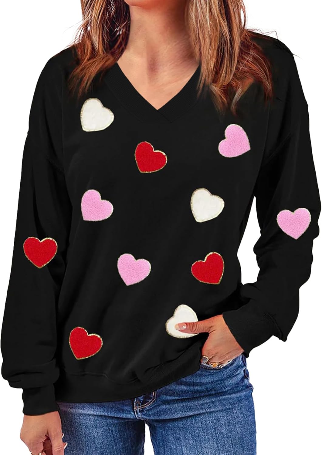 Womens V Neck Valentines Sweatshirts Cute Love Heart Shirts Long Sleeve Lover Valentine's Tshirts for Her