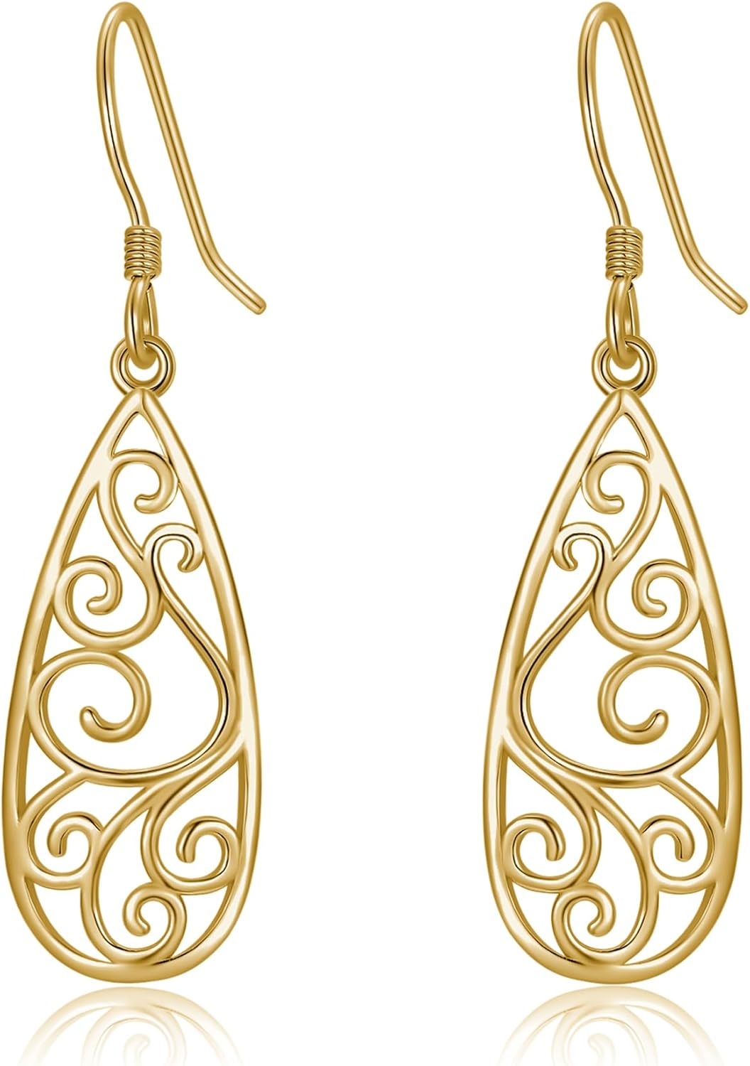 925 Sterling Silver Post Dangle Drop Earrings for Women 18K Gold Plated Filigree Teardrop Dangling Hook Earrings Jewelry for Birthday
