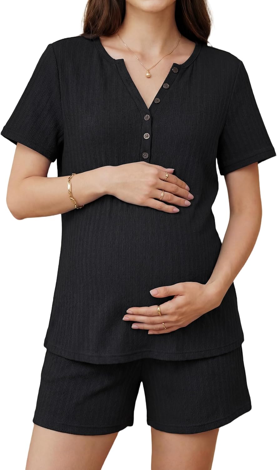 OUGES Women's 100% Cotton 2 Piece Maternity Nursing Pajama Sets Pregnancy Postpartum Loungewear with Pockets