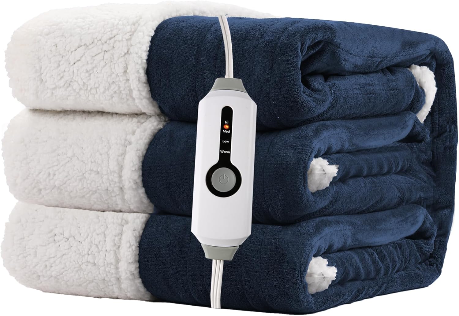 Electric Heated Blanket Full Size 72"x84" - Dual-Sided with Microplush & Sherpa Fabric, 4 Heat Settings & 10 Hours Auto Off, Machine Washable - Dark Blue