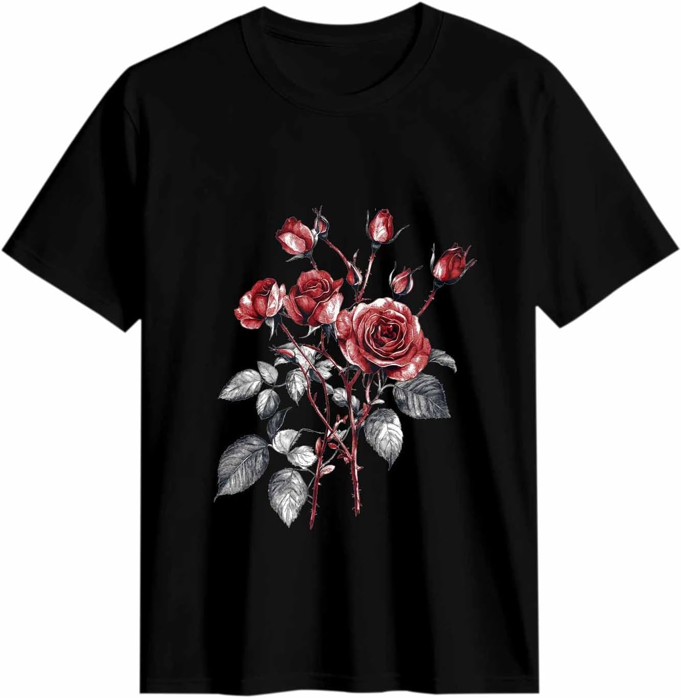 Graphic T Shirts for Women, Red Rose Vintage Cotton Girls Tees Short Sleeve Crewneck Summer Gym Casual Tops