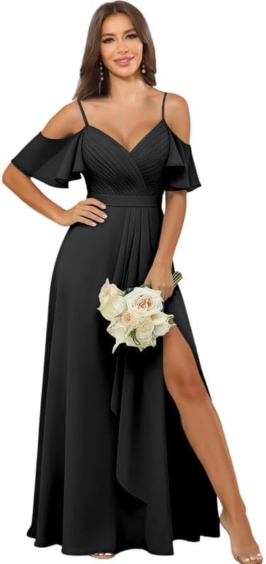 Chiffon Bridesmaid Dresses for Women Off Shoulder Spaghetti Straps Long Formal Evening Dress with Slit