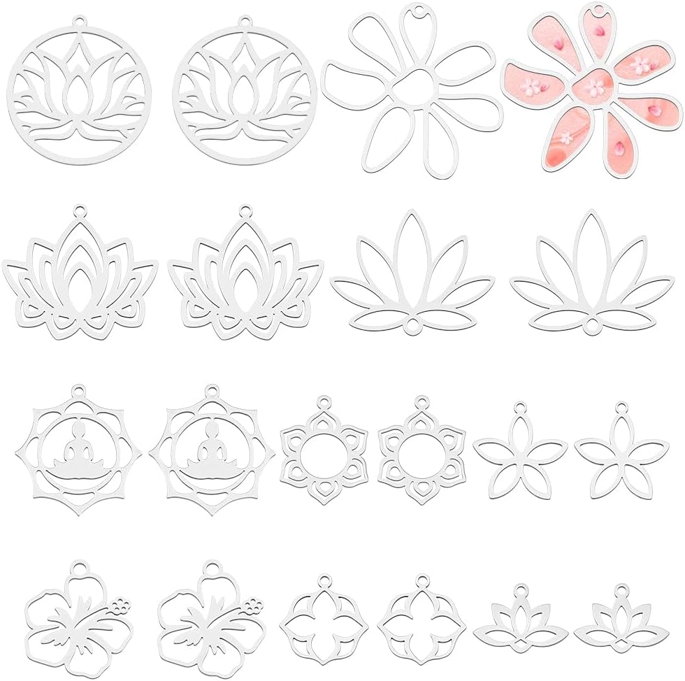 WADORN 20Pcs 10 Styles Open Back Bezel Frame Pendants, Stainless Steel Hollow Lotus Flower Charms Hollow Flower Yoga Frame Dangle Charms for DIY Jewelry Making Resin Necklace Bracelet Earring