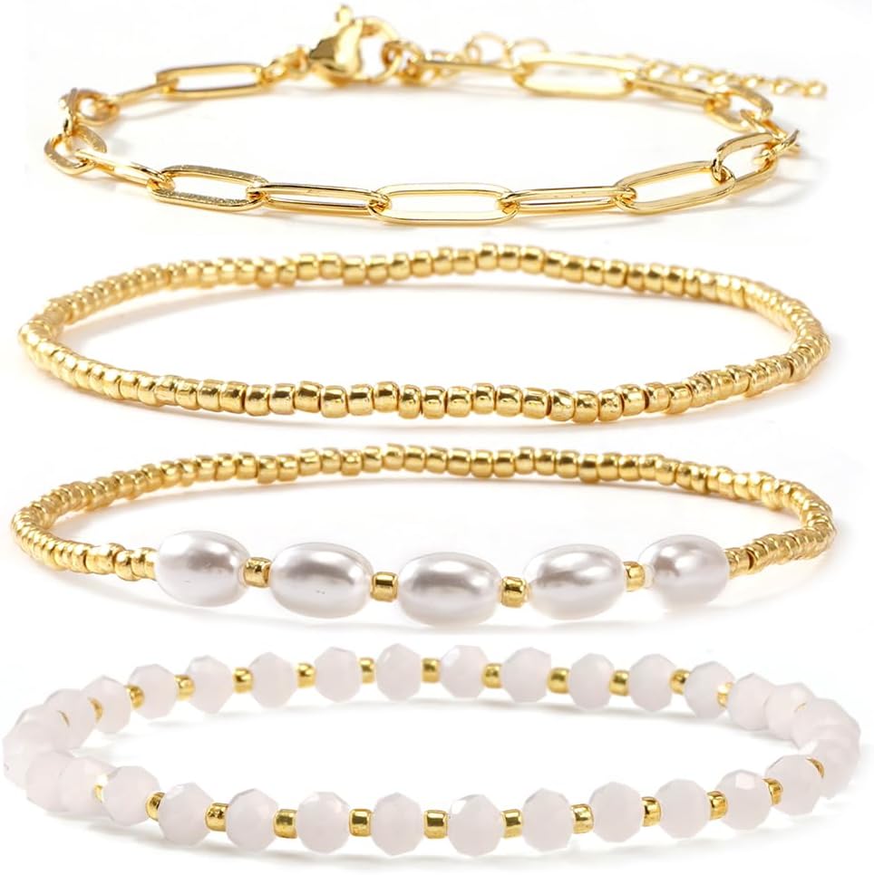 14K Gold Plated Seed Bead 4Pcs Stack Paperclip Link Bracelets Set for Women, Trendy Elegant Link Chain Gemstone Quartz Stretch Accessories Ball Jewelry Daily Friendship Gift