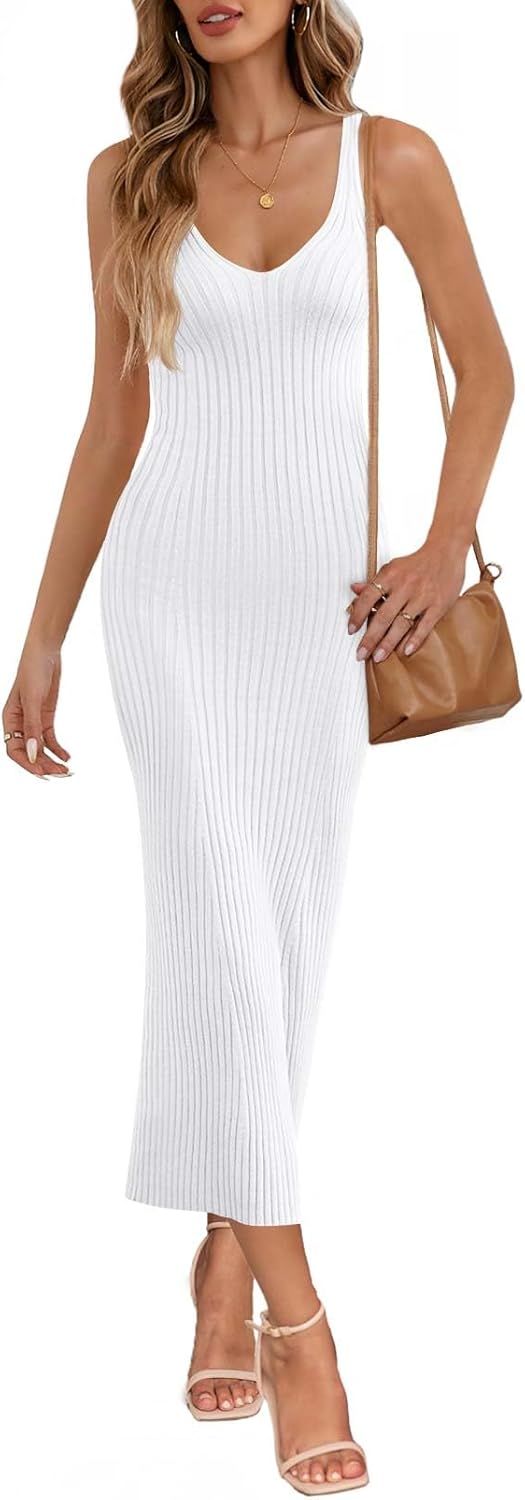 MEROKEETY Womens Summer Spring Midi Dress 2026 Beach Vacation Bodycon V Neck Casual Sleeveless Ribbed Knit Sweater Dresses