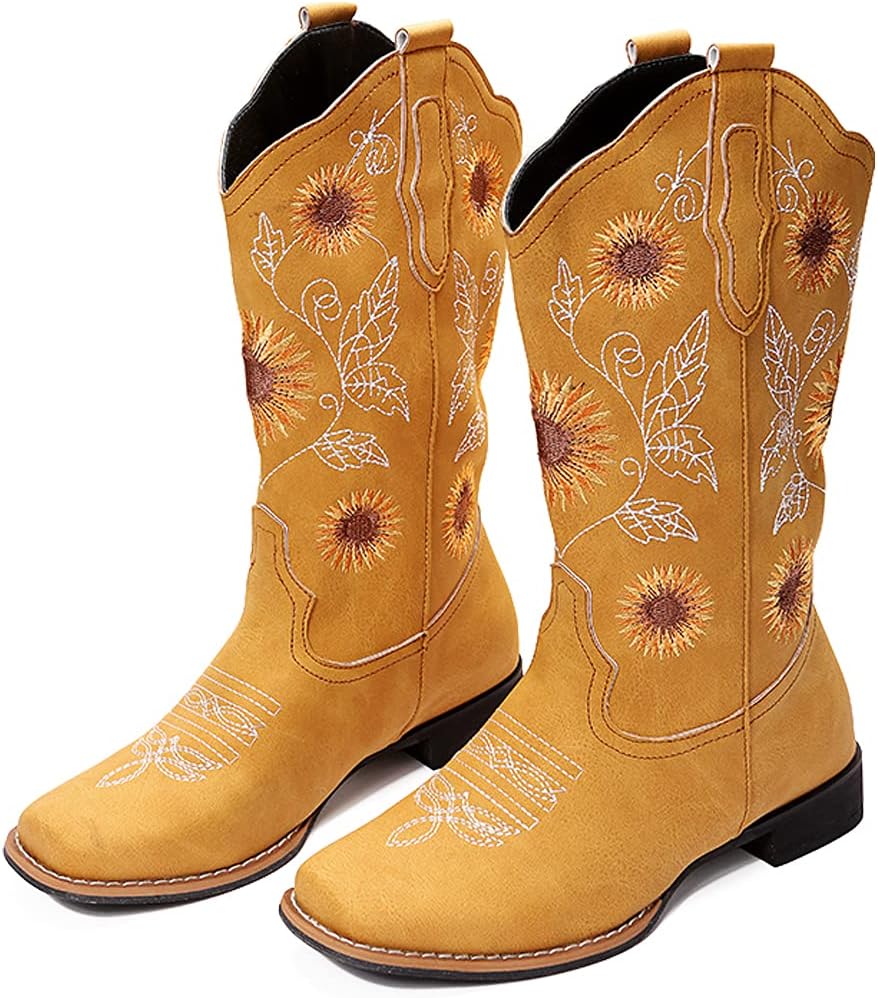 gloryinterest Cowboy Boots for Women Mid Calf Cowgirl Western Boots Sunflower Embroidery Stitched Square Toe Low Heel Black Brown Yellow US6-10.5