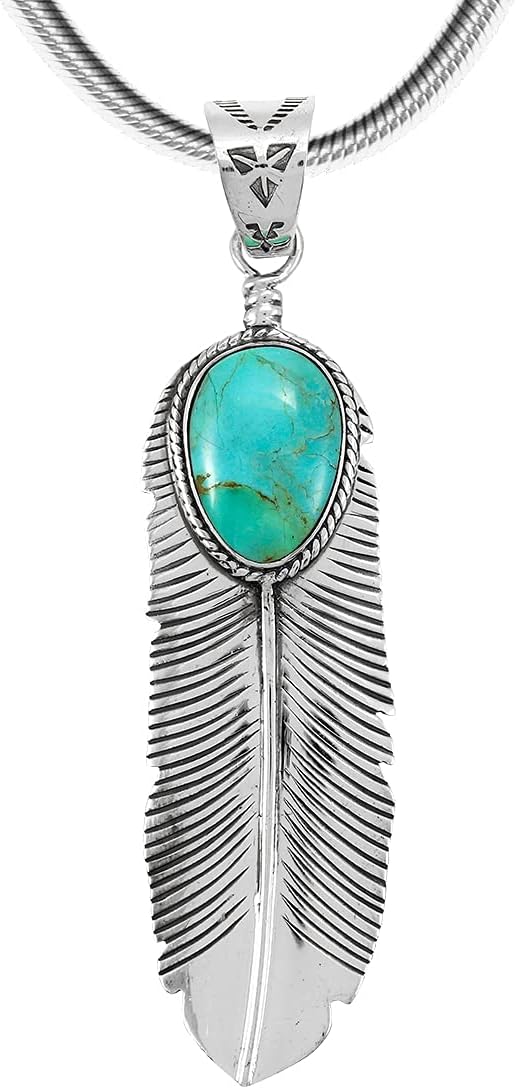 Turquoise Feather Pendant Necklace in Sterling Silver 925 & Genuine Gemstones (20" Length)