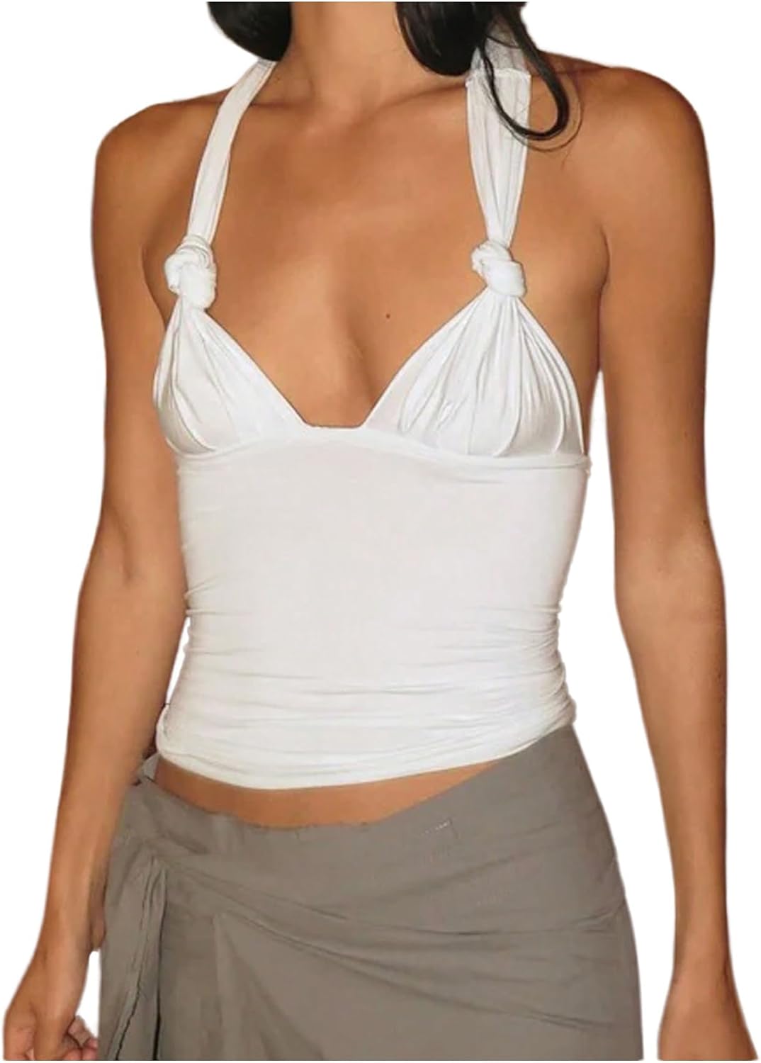 Milumia Women's Twist Knot Tie Backless Halter Top Y2k Ruched V Neck Sleeveless Tops