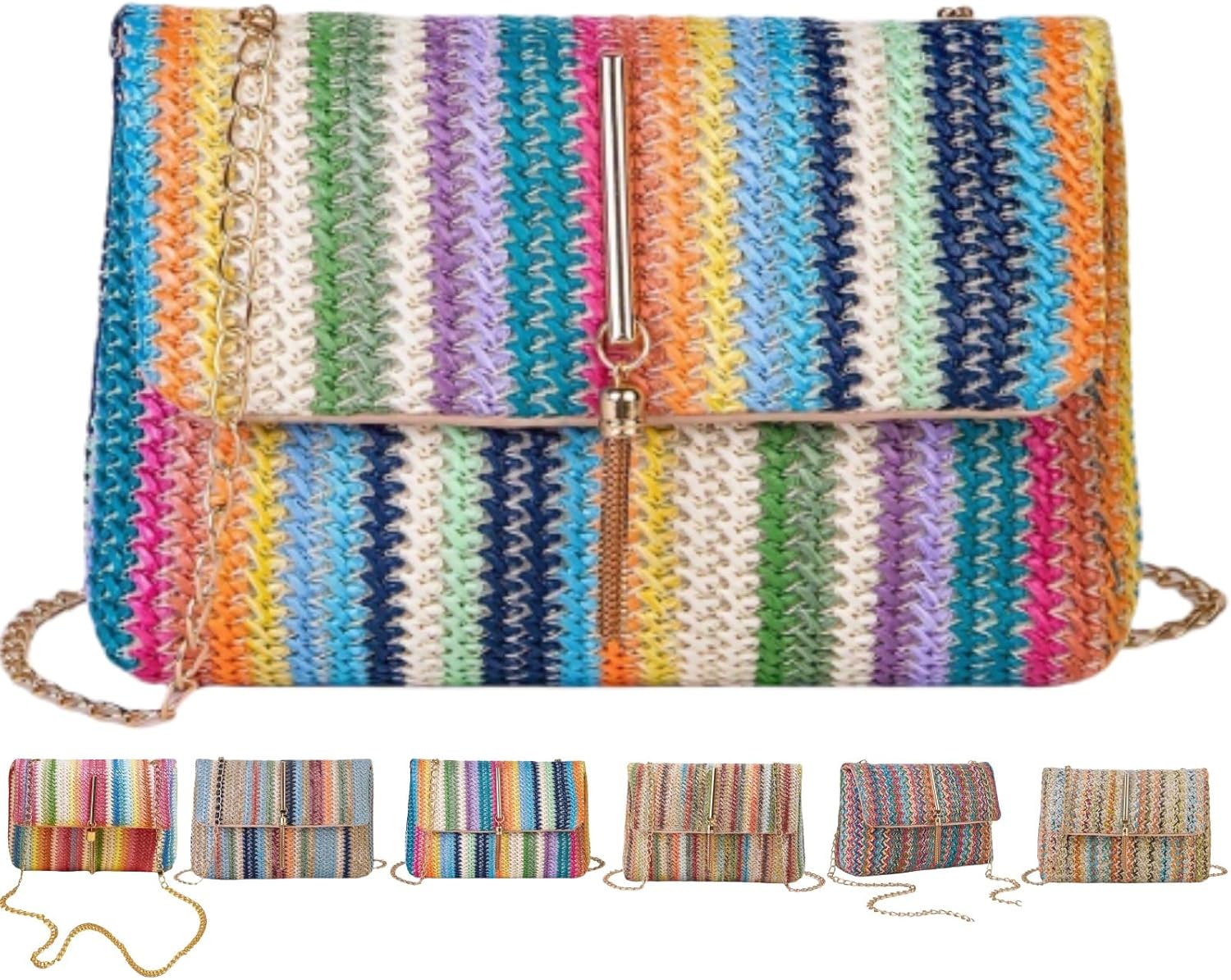 Straw Crossbody Bags for Women Trendy Fashion Tassel Decorated Summer Beach Casual Striped Pattern Flap Shoulder Bag
