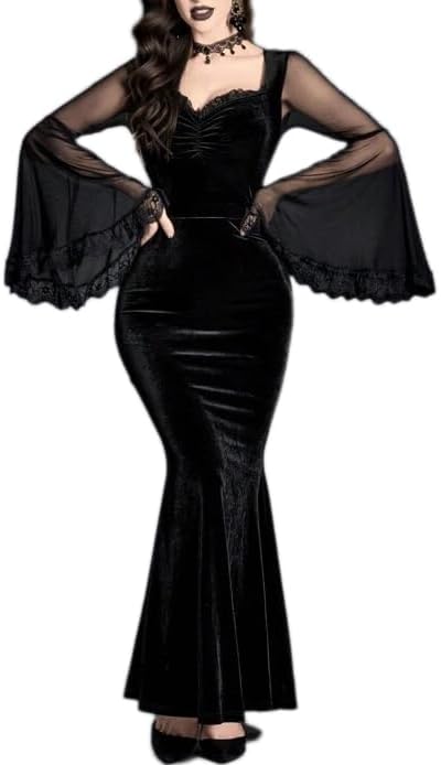 LANSHULAN Gothic Contrast Mesh Flounce Sleeve Velvet Mermaid Hem Dress Clothes