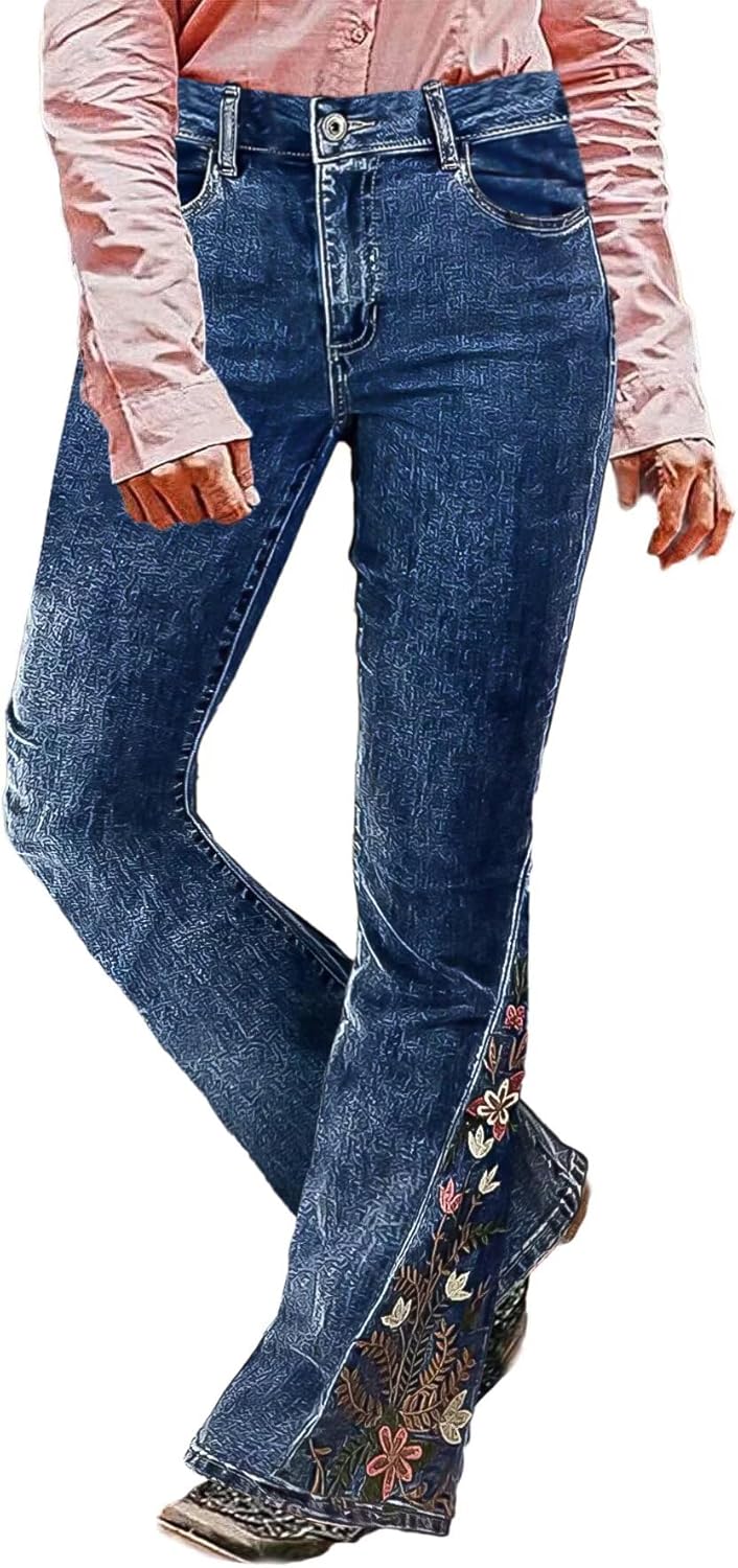 Flamingals Women's Floral Embroidery Mid Waist High Stretch Bootcut Jeans with Pockets