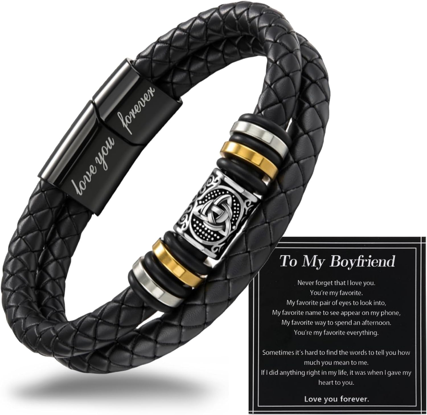 Mens Leather Bracelet,Black Stainless Steel Double-Row Braided Black Stainless Steel Love You Forever Engraved,Men Valentines Day Ideal Gift for Son & Grandson