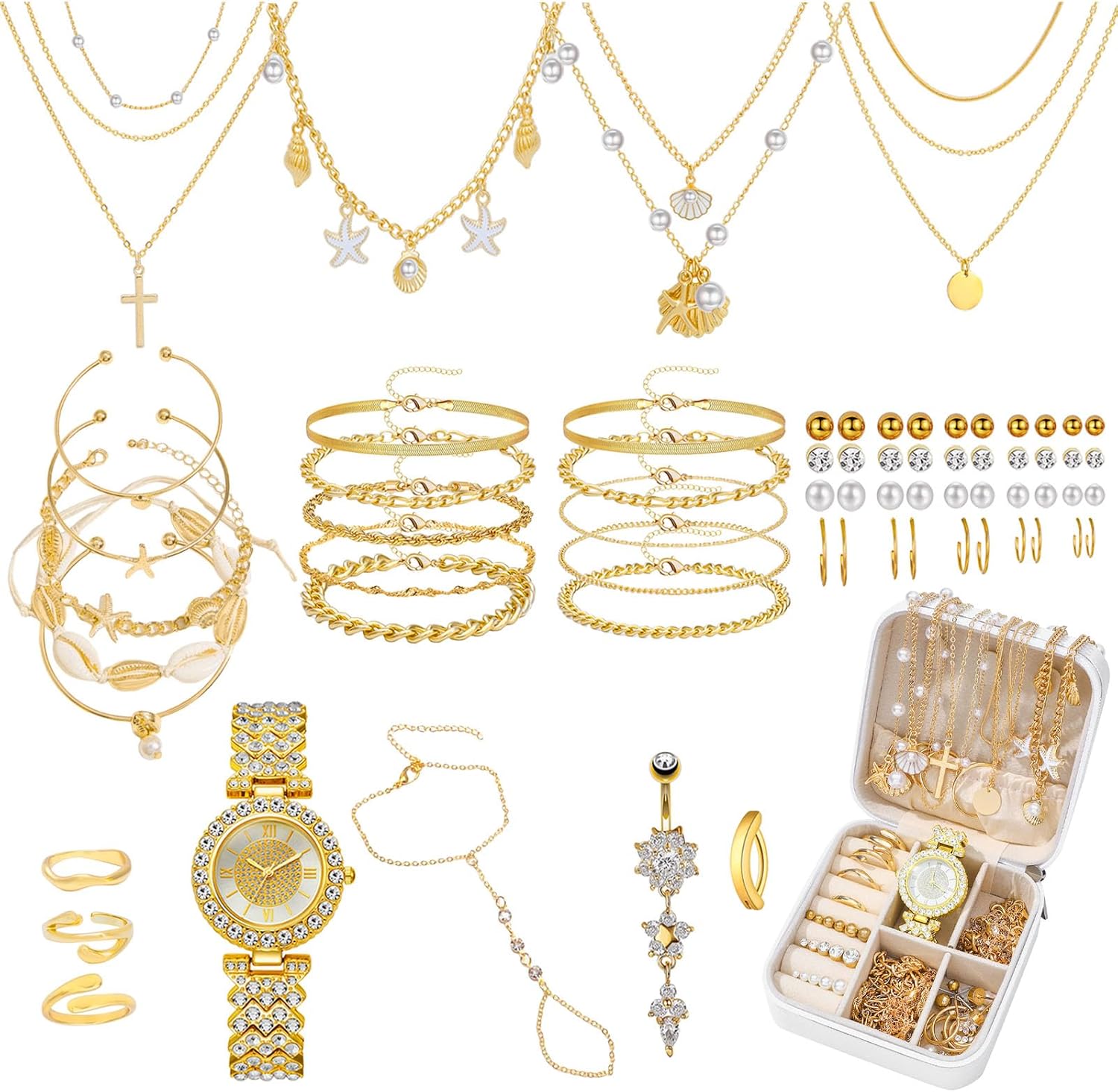 NEWITIN 69 Pieces Gold Jewelry Set for Women Jewelry Case with Gold Plated Necklace Bracelet Watch Ring Belly Button Rings Earrings Set for Women Travel Jewels Case