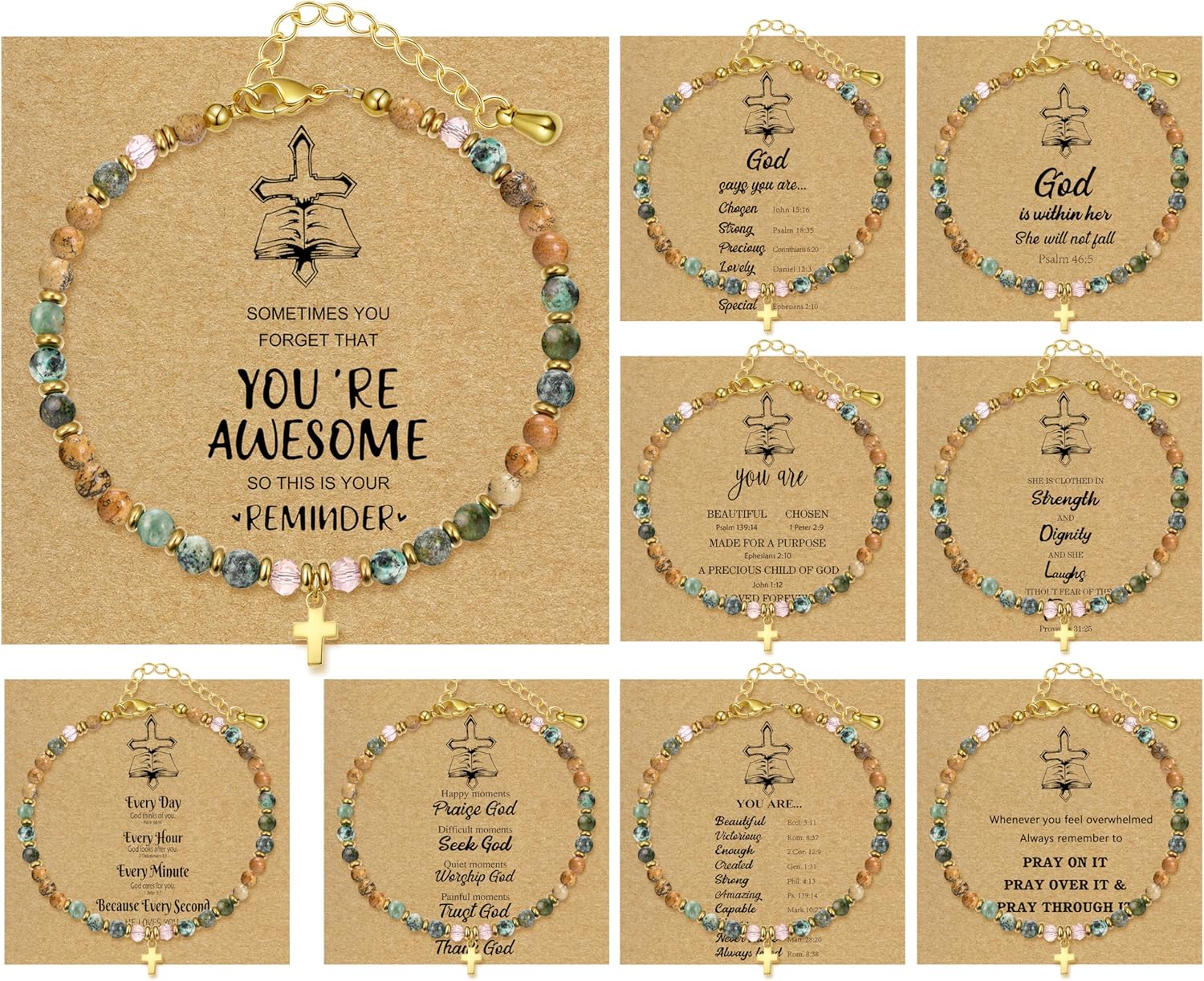 BOMAIL 9PCS Cross Bracelets for Women - Christian Inspirational Bracelets Gifts Healing Natural Stone Beaded Bracelets Set Adjustable Confirmation Baptism Easter Gift Bracelets