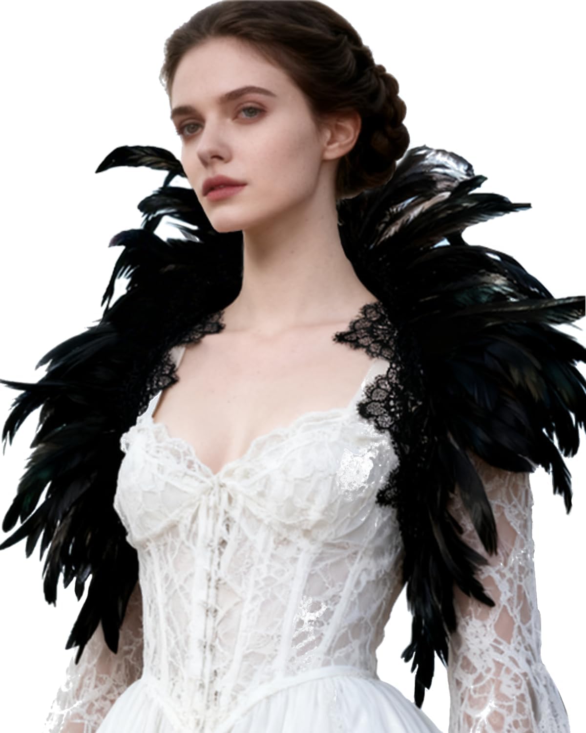ZAKIA Women's Black Real Feather Shrug Shawl Wrap Lace Collar Halloween Costume Scarf Feather Bow Cape