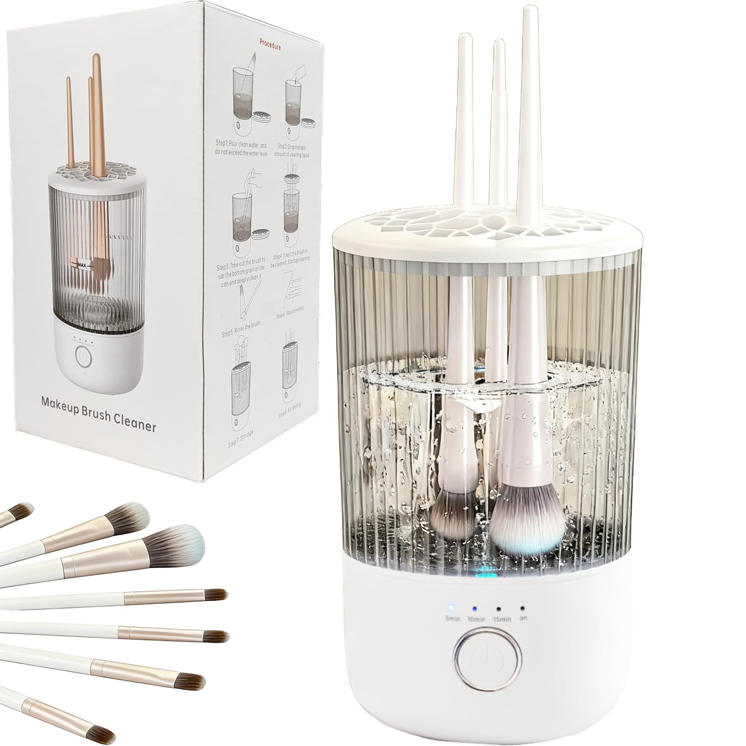 - Deep Cleaning & High Efficiency: This electric makeup brush cleaner has 4 precision timers (5/10/15 min+no timer), which can achieve 360 ° rotating cleaning. It operates with a powerful 7W power, effectively cleaning various makeup brushes and tools. Its appearance is mainly in exquisite black and white colors, highlighting fashion and atmosphere, and serving as a beauty partner