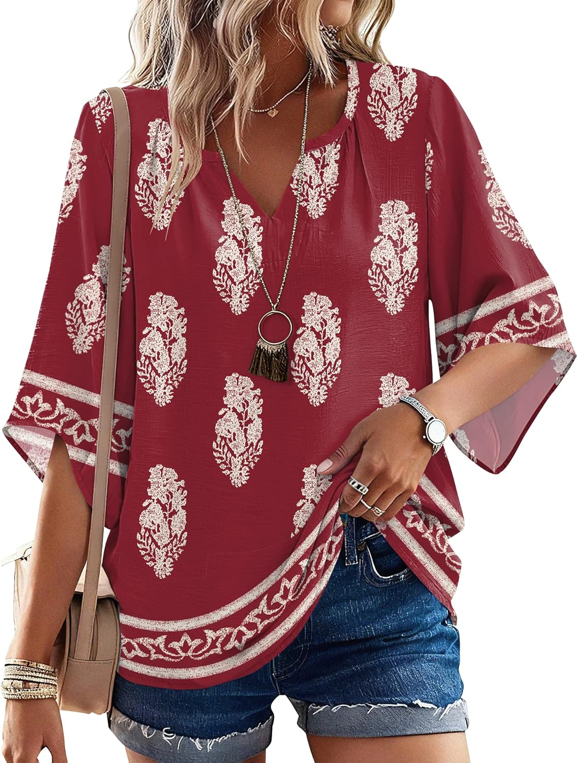 LOMON Women's 3/4 Length Sleeve Boho Tops V Neck Casual Vacation Clothes Loose Fit Tunic Shirts S-3XL