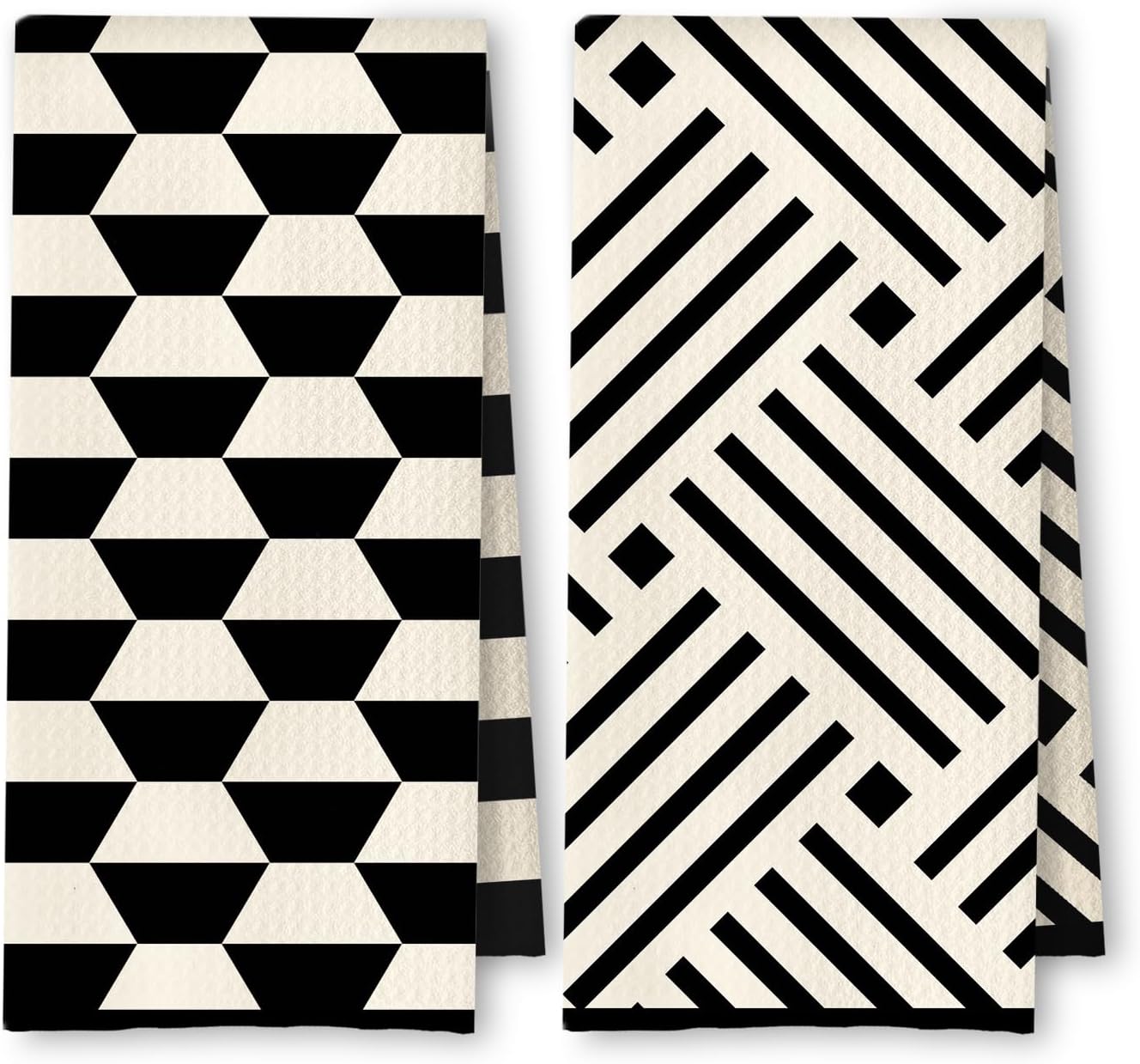 Black and White Kitchen Towels Set of 2, Boho Minimalist Abstract Dish Tea Towels for Kitchen Decor, Retro Mid Century Modern Hand Towels for Bathroom Decor, 16x24 Inches