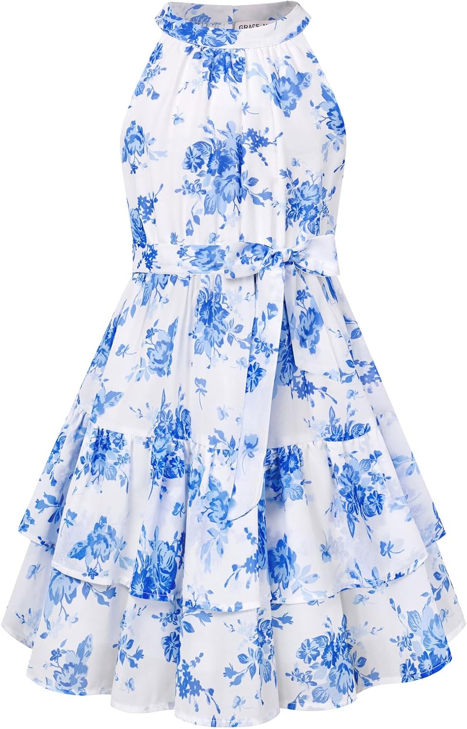GRACE KARIN Girls Summer Beach Dress Floral Hawaiian Halter Chiffon Party Wedding Vacation Sundress 7-14Y