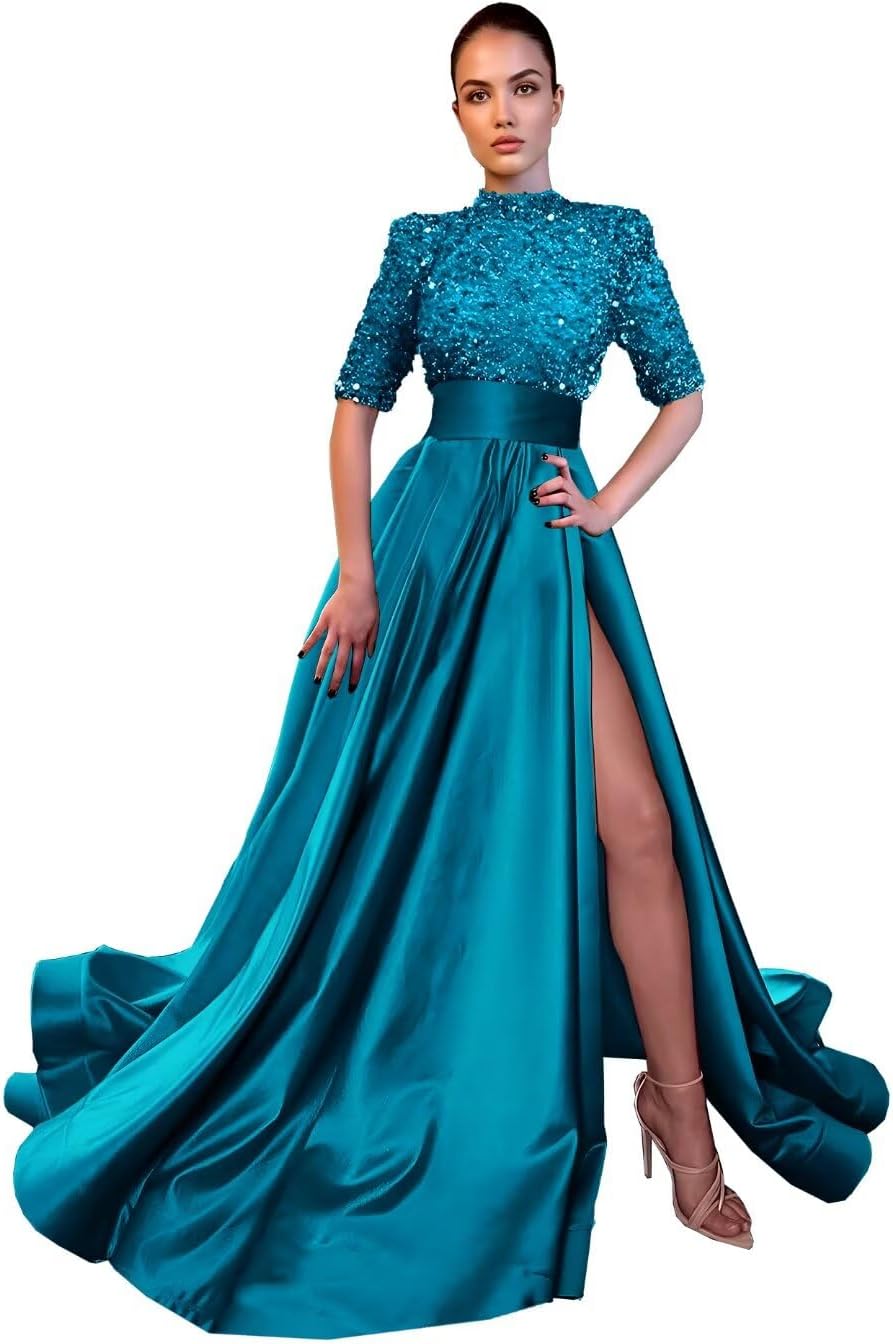 Mock Turtle Neck Prom Dresses Half Sleeve Formal Gowns Sequins Satin Evening Dress A-Line Ball Gown Slit JS0005
