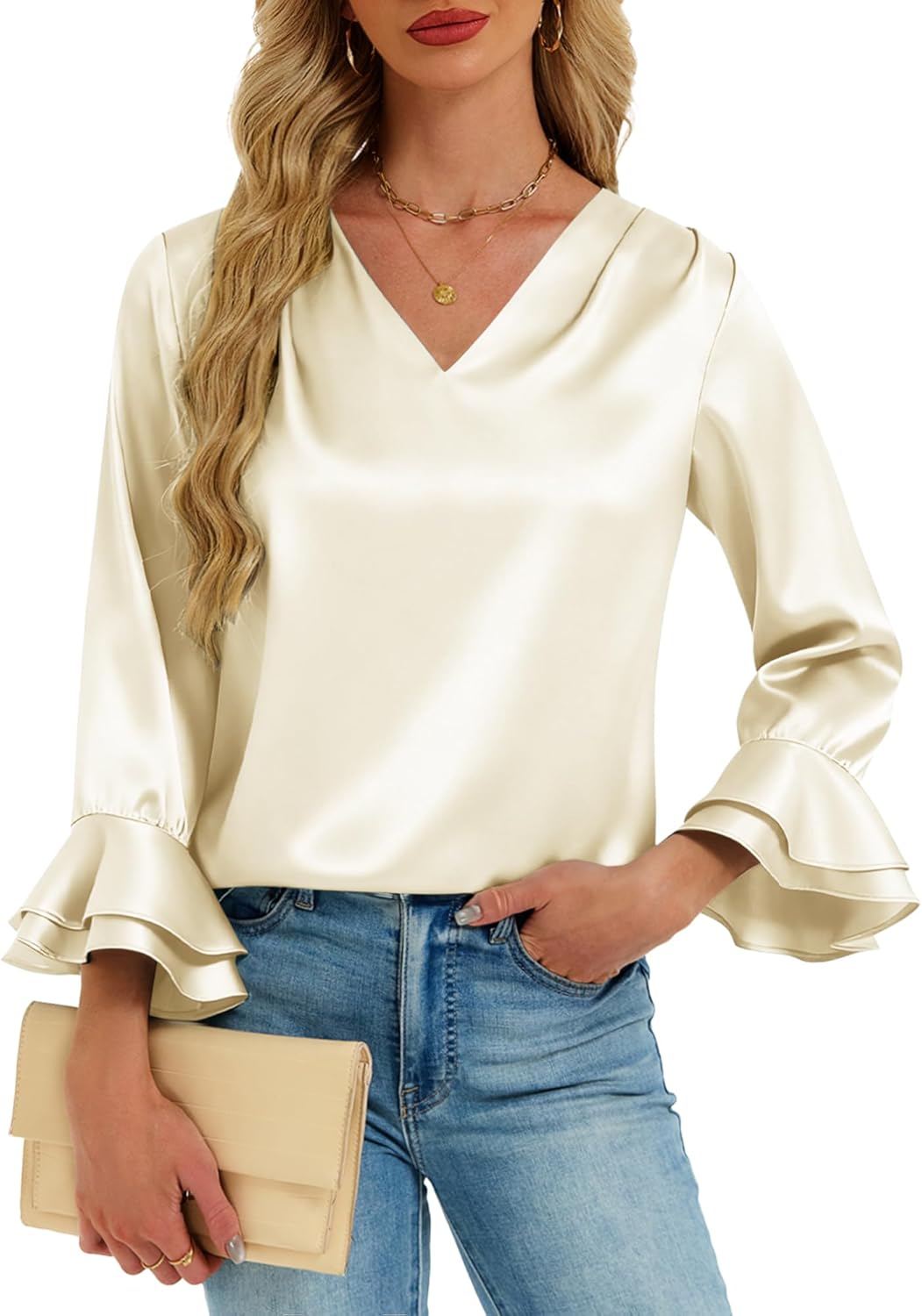 Womens Satin Silk Blouses 3/4 Sleeves Ruffle Shirts Dressy Business Casual Tops V Neck Pleated Elegant Work Office Wear