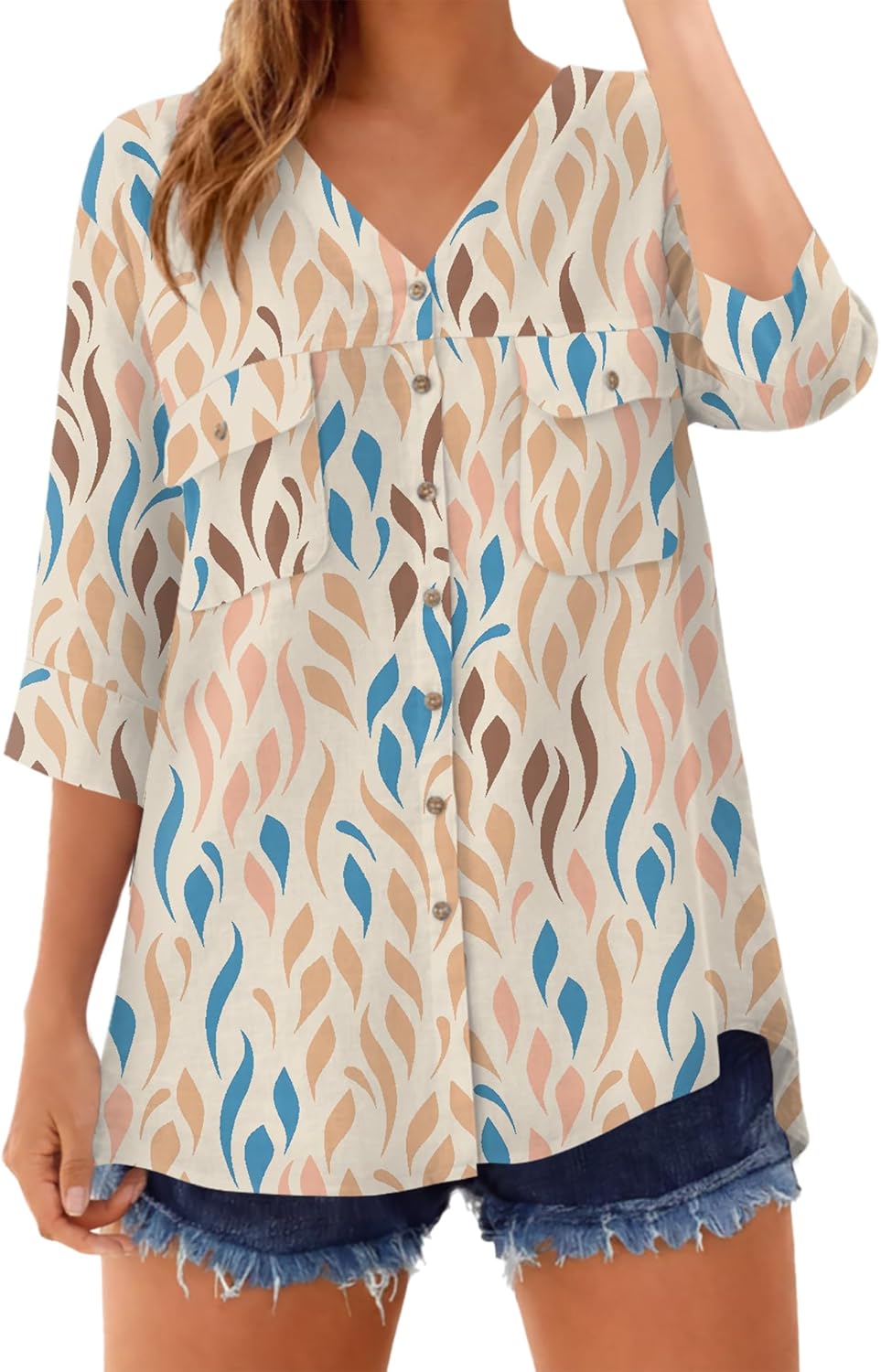 LOMON Women's Button Down Shirts Summer 3/4 Sleeve V Neck Blouses Lightweight Casual Office Work Tops with Pockets