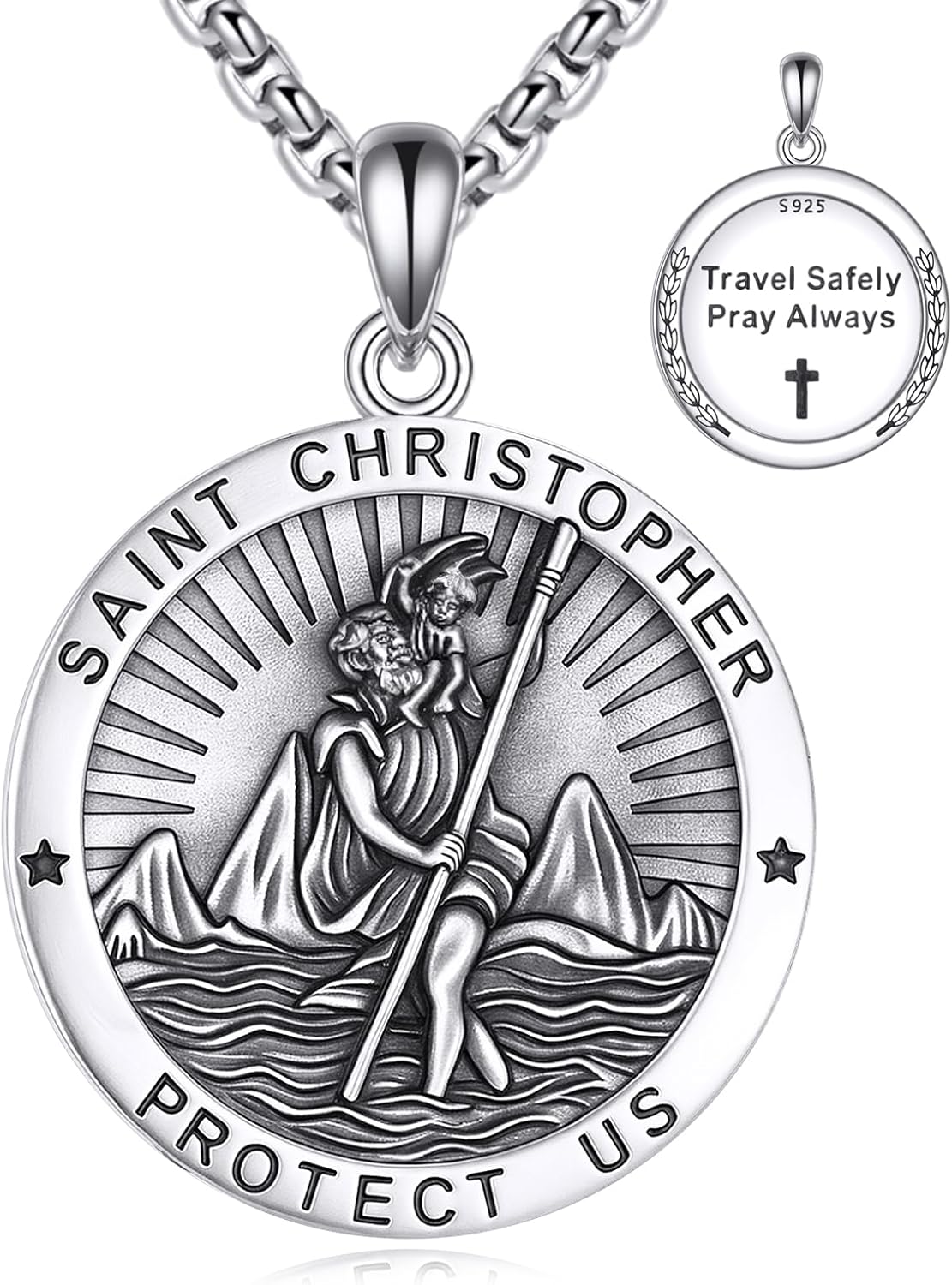 Saint Necklace 925 Sterling Silver Patron Saint Medal Pendant Amulet Protection Religious Jewelry for Men Women with 2.5mm 22"+2" Steel Chain (with Gift Box)