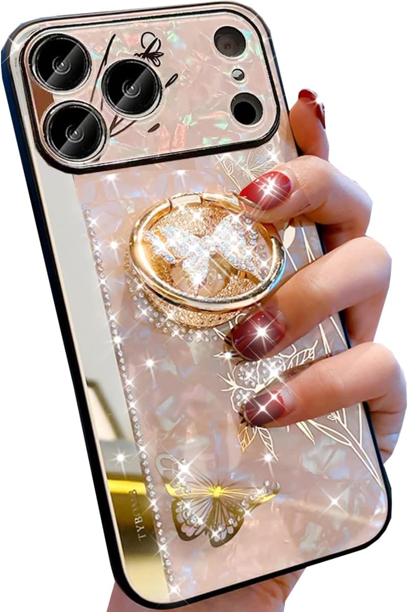 - ❥【Compatible with Apple iPhone 17 Pro 6.3" 】The cute Luxury Glitter Bling Sparkly Shiny Slim women men diamond butterfly ring holder stand kickstand floral pattern design Aesthetic Elegant Shockproof phone Cover Case is ONLY Designed for iPhone 17 Pro 5G 6.3 inch (2025),Not fit for other phone models.Please check your phone model and make sure you order the right size. Note: the case Can NOT support the wireless charging.