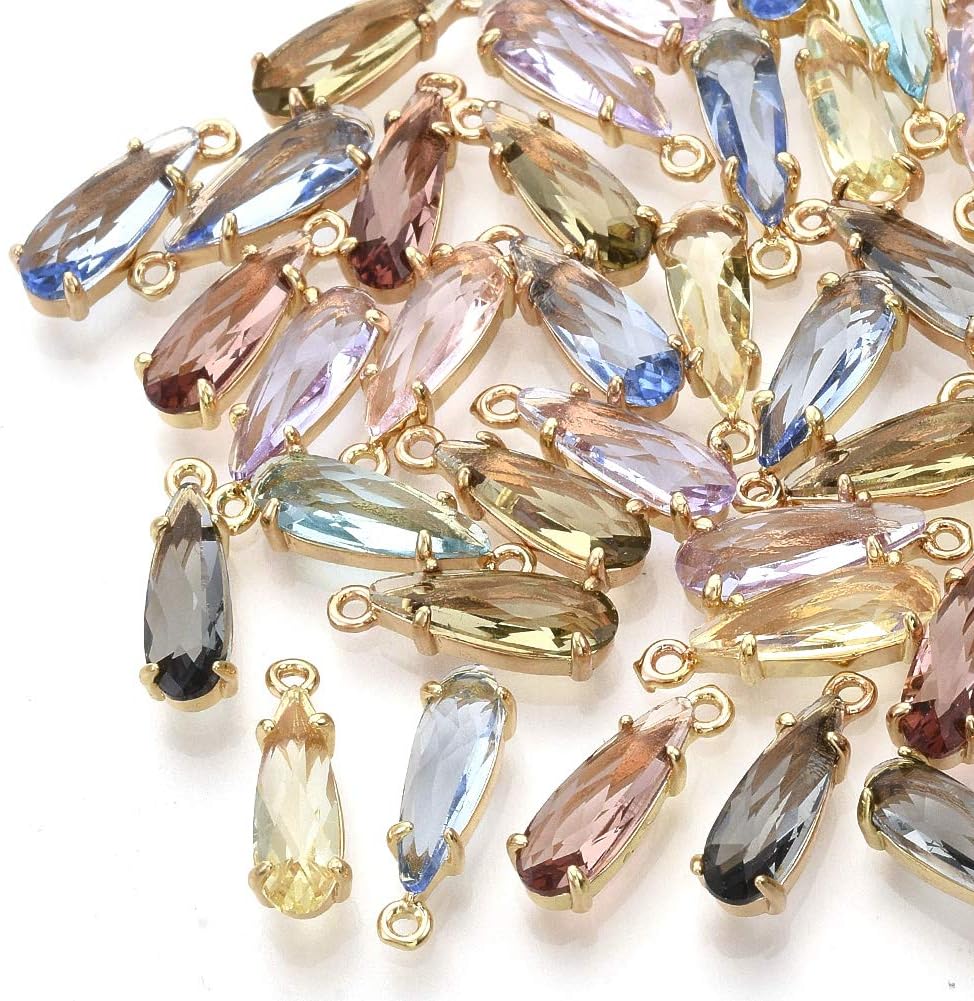 FASHEWELRY 50Pcs Teardrop Faceted Glass Pendants Mixed Colors Crystal Glass Dangle Oval Drop Bead Charms with Golden Open Back Settings for Jewelry Craft Making