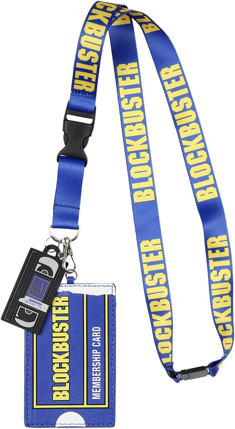 - MEMBERSHIP CARD DESIGN AND RUBBER PENDANT: The lanyard features a 2" rubber pendant. The ID holder is done to look like a classic Blockbuster Membership card and is made of PU. The lanyard has an allover Blockbuster script pattern,