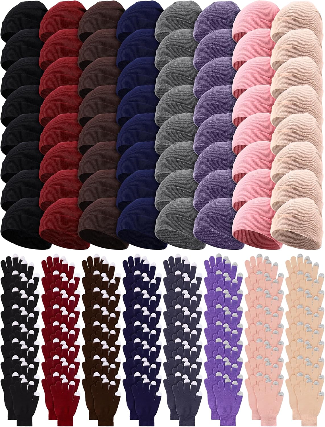 Suhine Bulk Winter Beanie Gloves Set for Homeless Knit Hats Gloves Unisex Skull Caps Gloves for Women