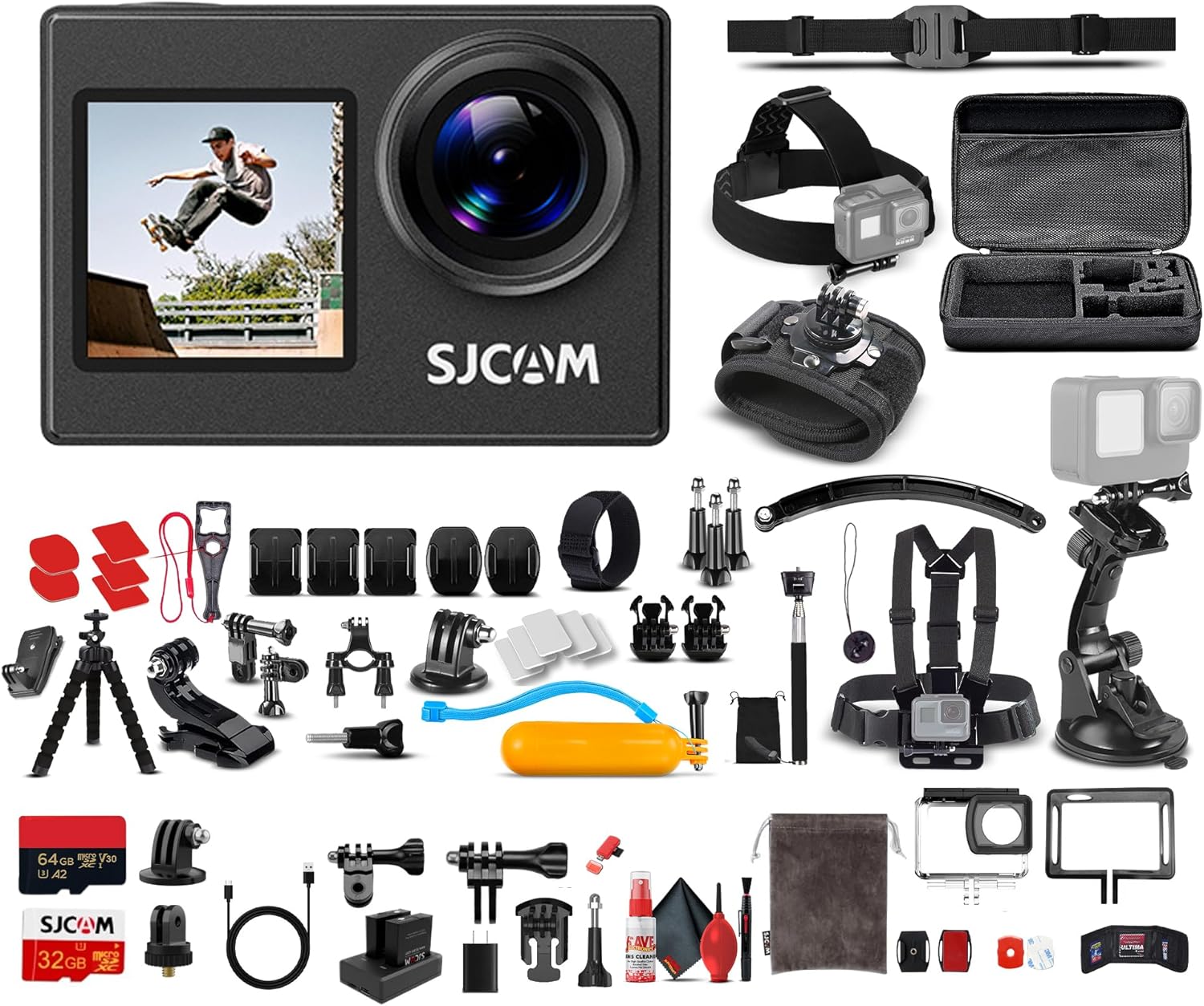 - This Bundle Includes: SJCAM SJ4000 Dual Screen Action Camera, 64GB Micro SD Card, 50-in-1 Action Kit, Card Reader, Card Wallet, USB-C Adapter