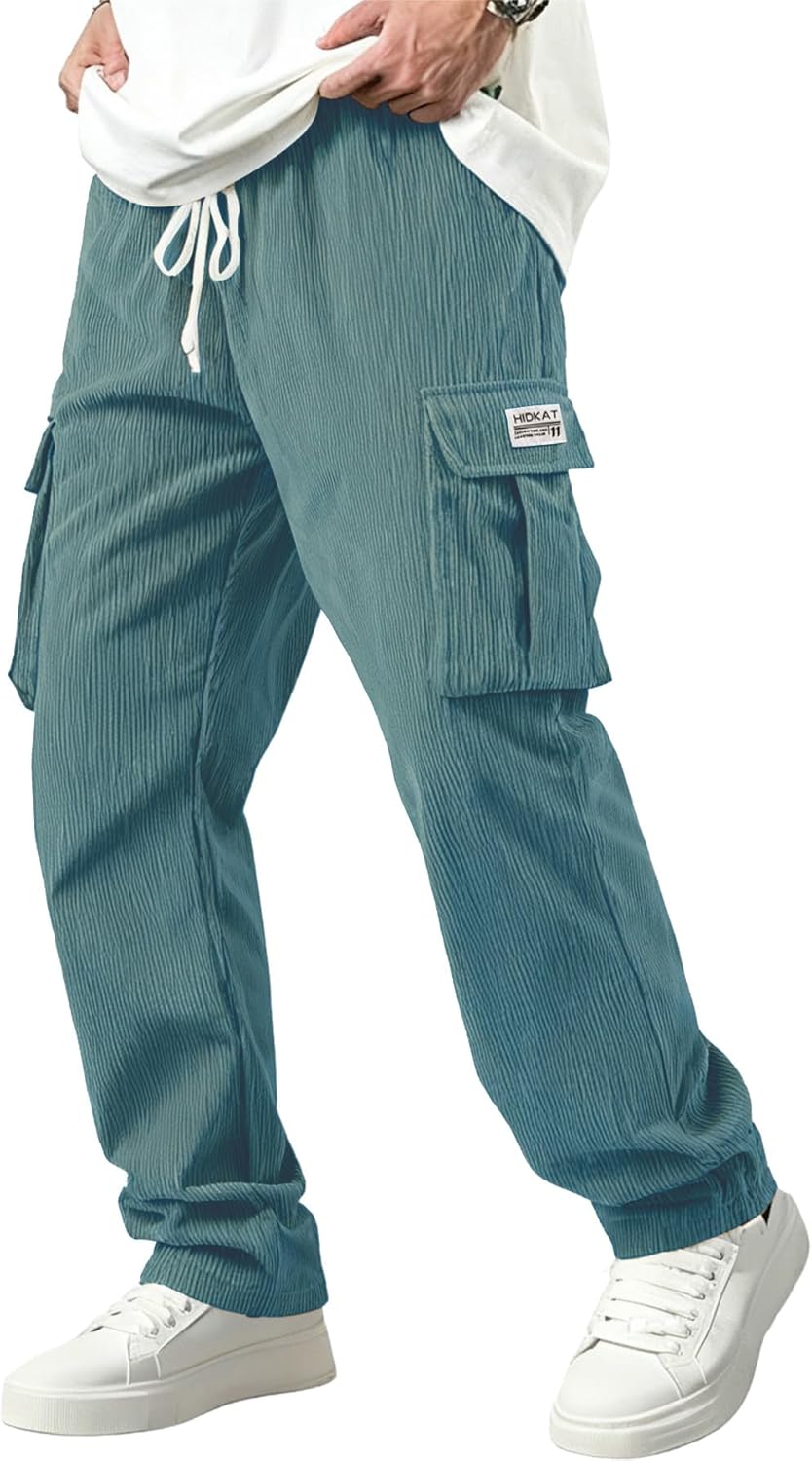 Men's Corduroy Cargo Pants - Comfortable Casual Trousers Elastic Drawstring Waist for Everyday wear and Outdoor