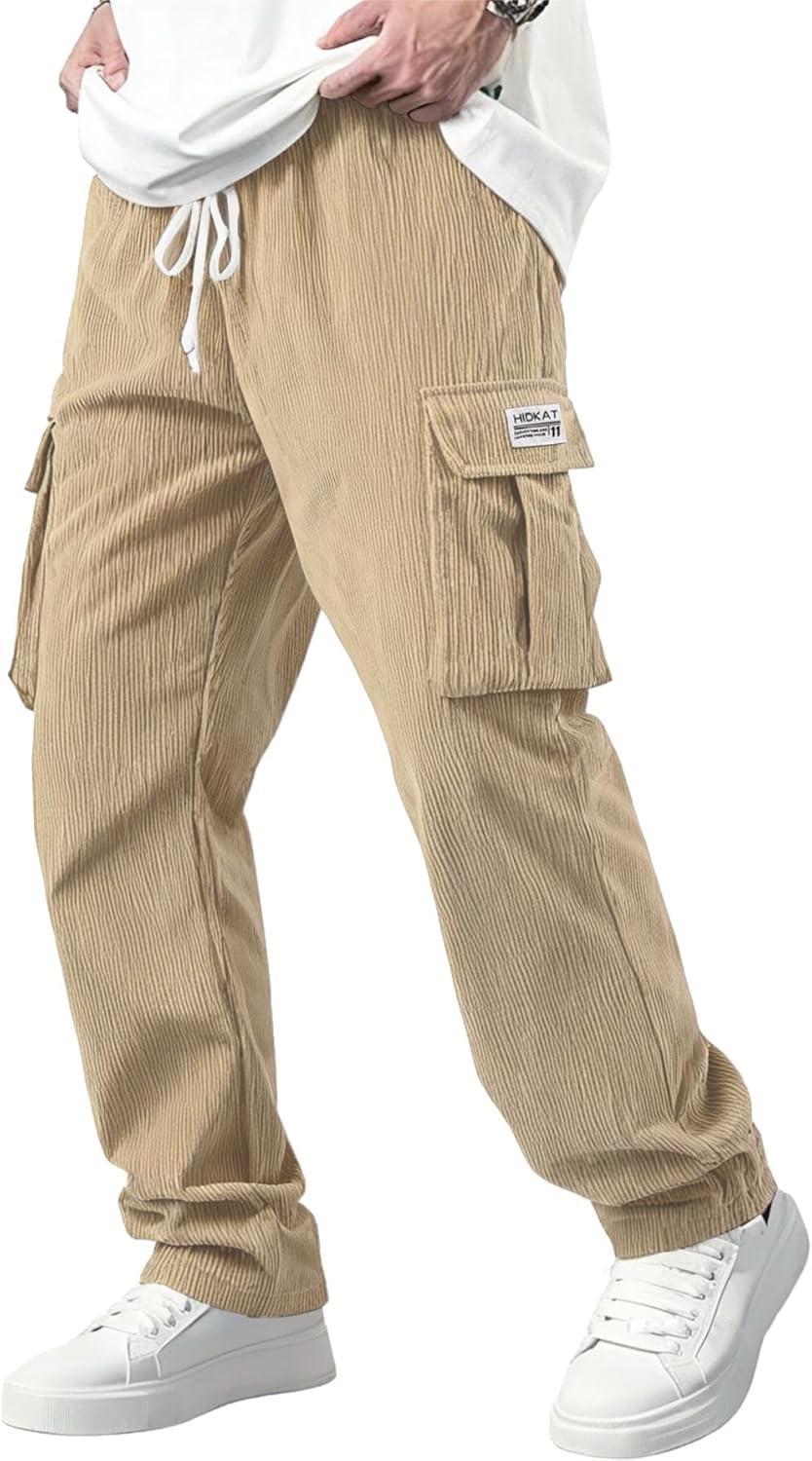 Men's Corduroy Cargo Pants - Comfortable Casual Trousers Elastic Drawstring Waist for Everyday wear and Outdoor