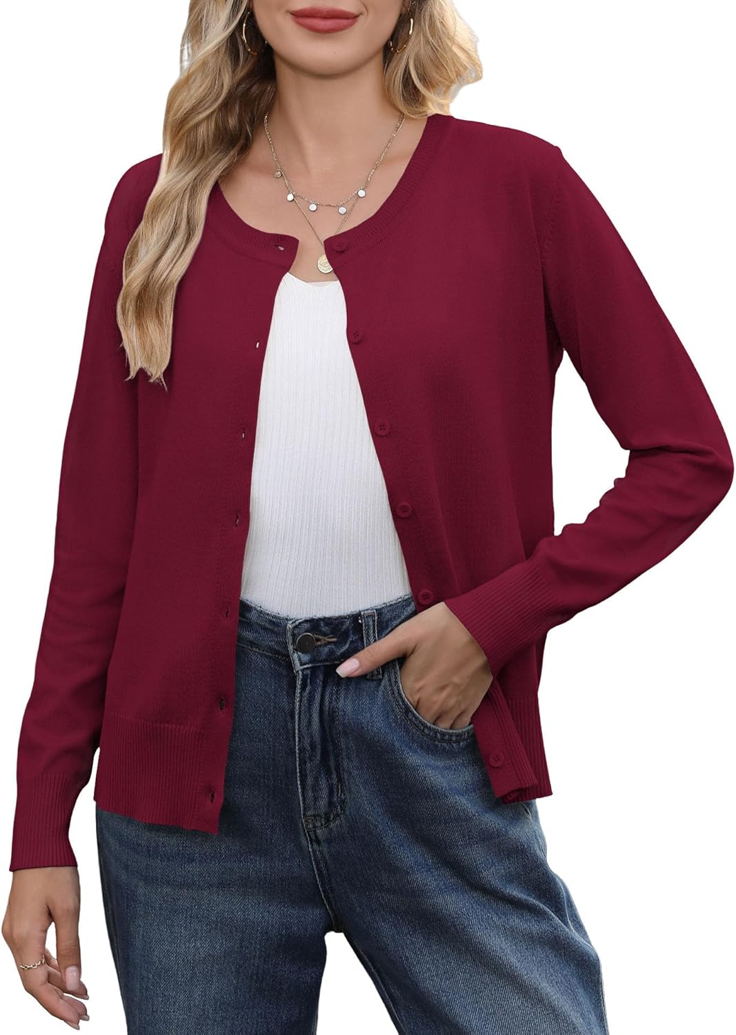 Bettysays Women's Lightweight Button Down Cardigan Casual Long Sleeve Crew Neck Soft Knit Cardigans Sweater