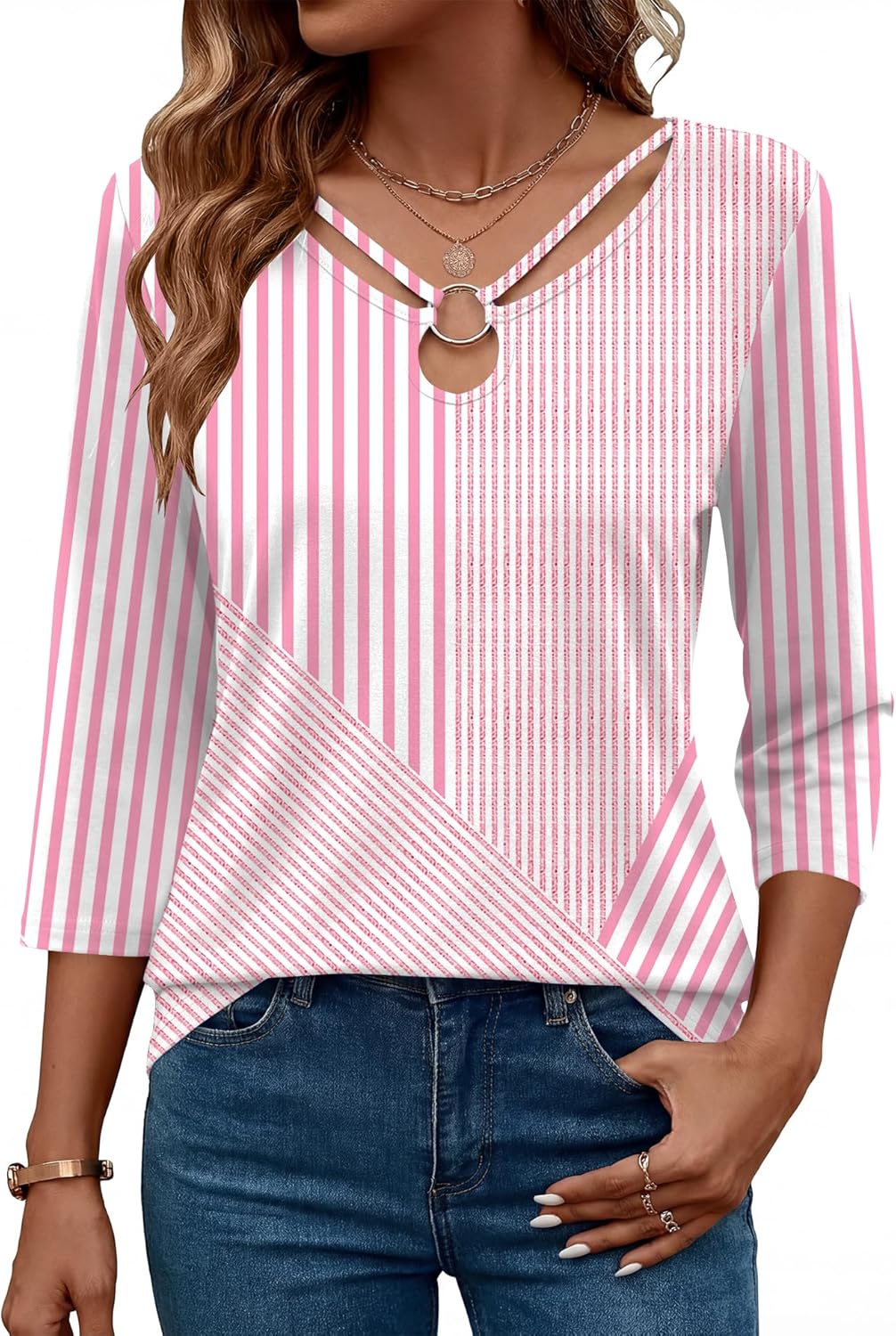 Rapbin 3/4 Length Sleeve Womens Tops Summer Cut Out Ring Keyhole Neck Dressy Casual Crew Neck Tee Shirts 2026