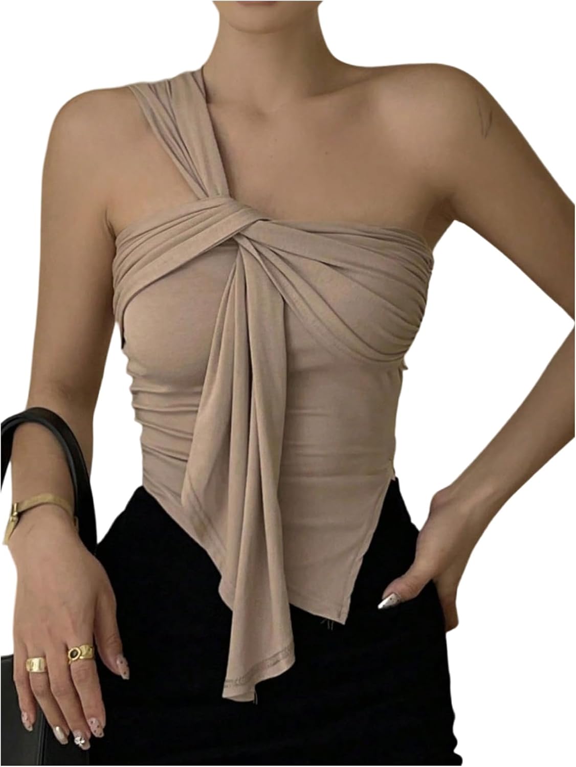 Women's One Shoulder Twist Front Tank Top Sleeveless Fitted Ruched Going Out Tops Date Night Outfit