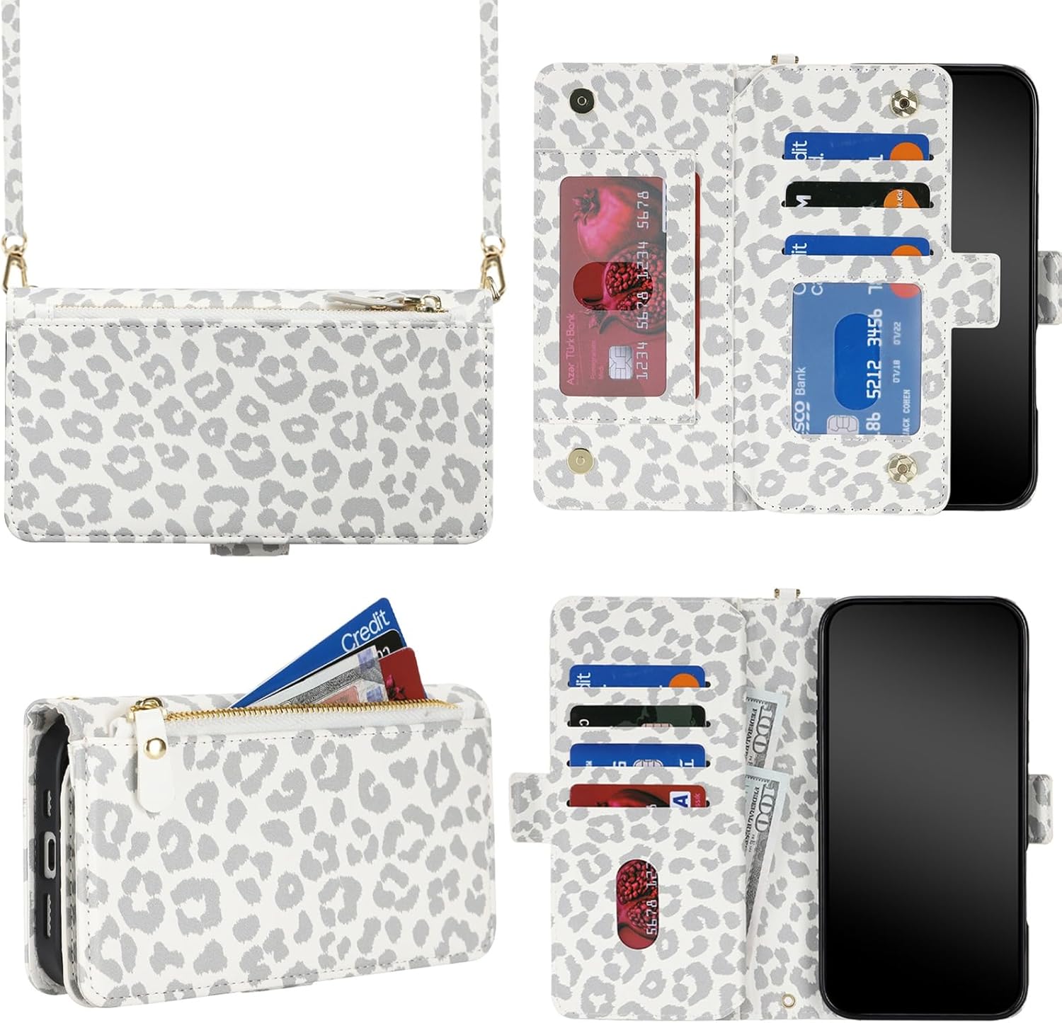 - Jaorty for iPhone 13/14 Phone Case Wallet with Crossbody Strap, Shoulder Necklace Lanyard,flip Cover PU Leather, for Women Men, Zipper Pocket, Kickstand, Card Holder, 6.1" White Leopard