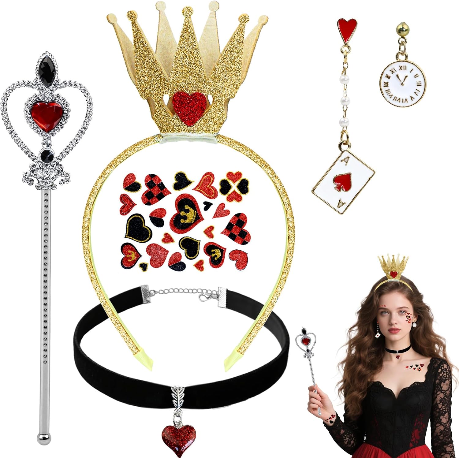 Dokeawo Hearts Queen Costume Accessories Women- Red Hearts Crown Headband, Earrings, Wand, Necklace & Tattoo Stickers for Halloween Cosplay Birthday Party Dress Up