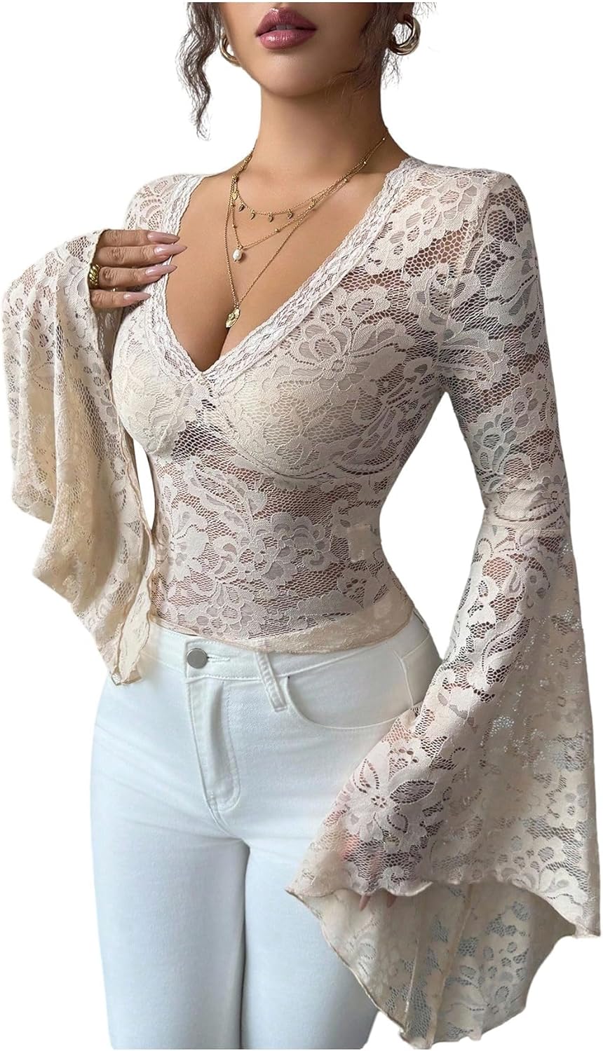 MakeMeChic Women's Floral Lace Deep V Neck T Shirts Bell Sleeve Mesh Fitted Crop Tops