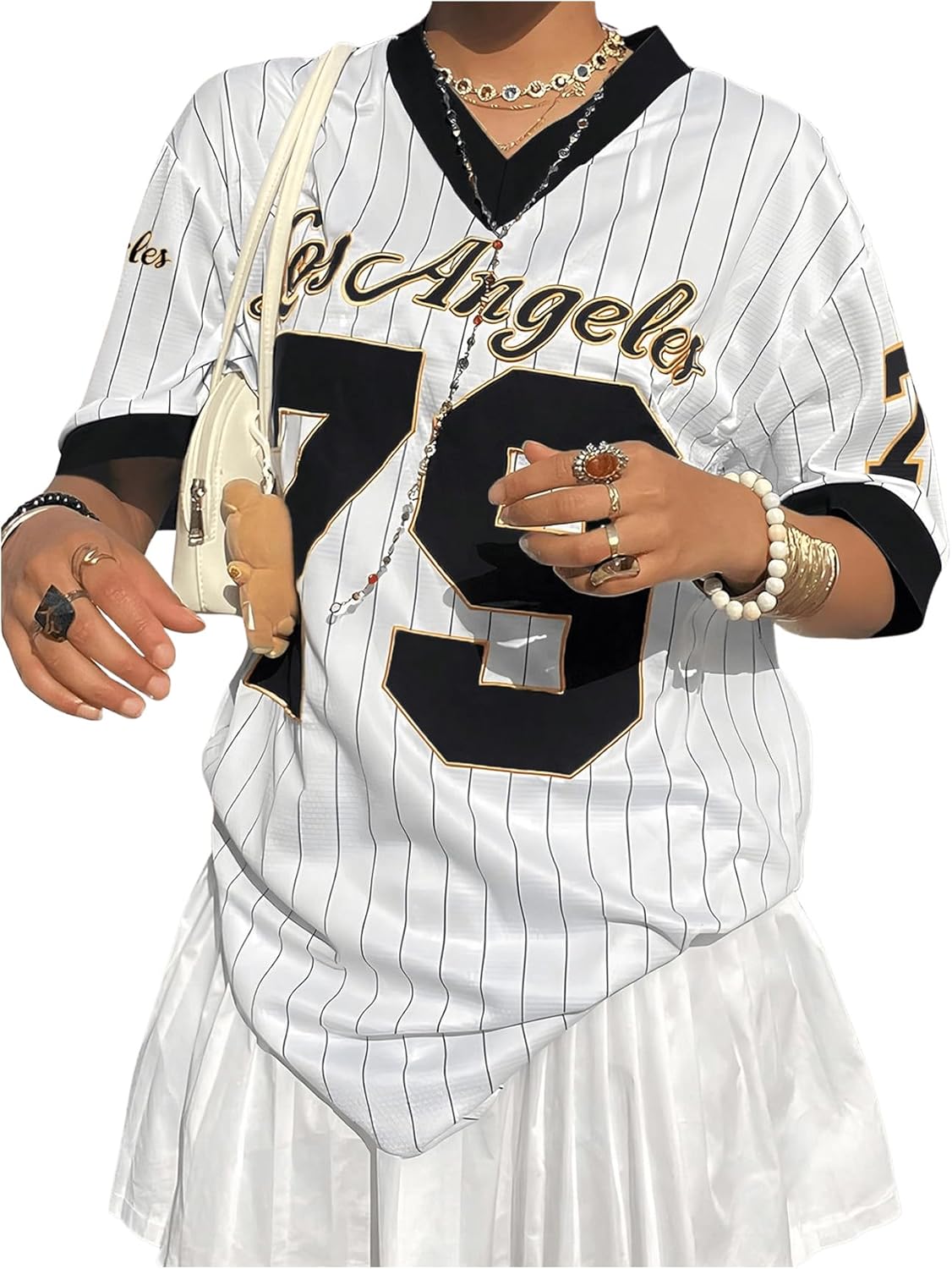 Verdusa Women's Jersey Shirts for Women Y2k Oversized Plus T Shirt Striped Number Graphic Tees Streetwear Tops