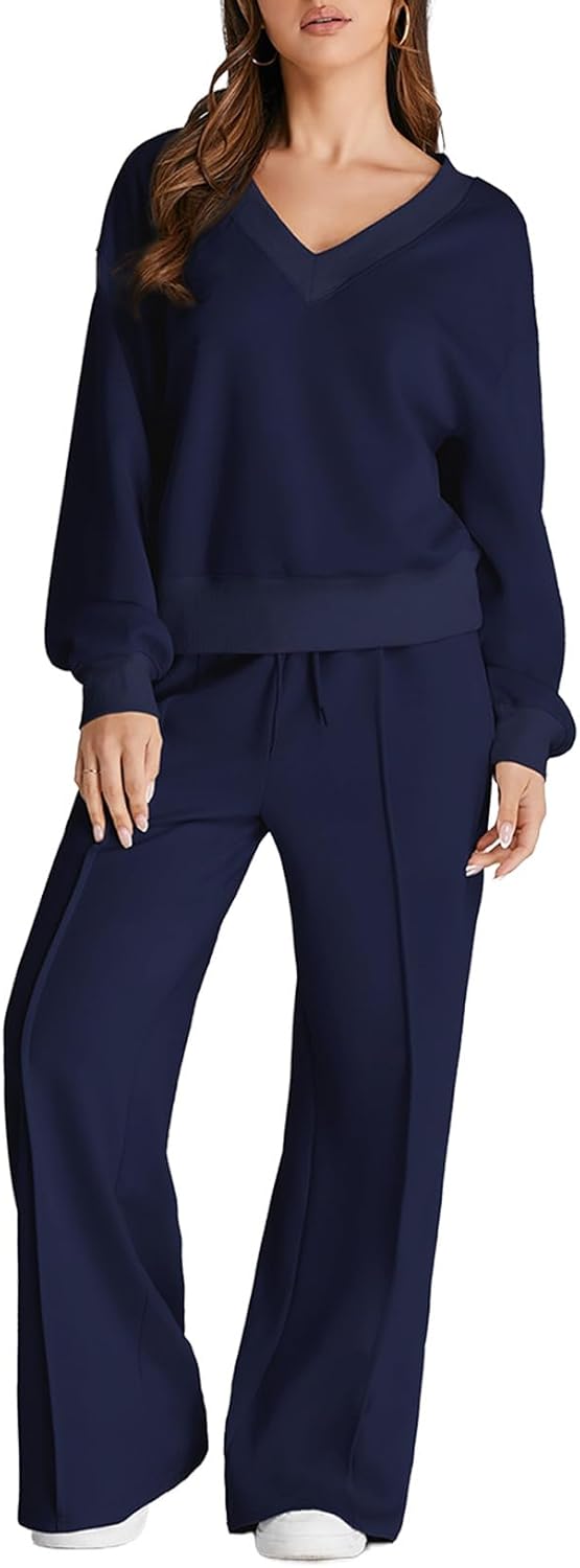 Herseas Women 2 Piece Outfits Sweatsuit 2025 Fall Casual V Neck Sweatshirt with Wide Leg Sweatpants Tracksuit Lounge Set